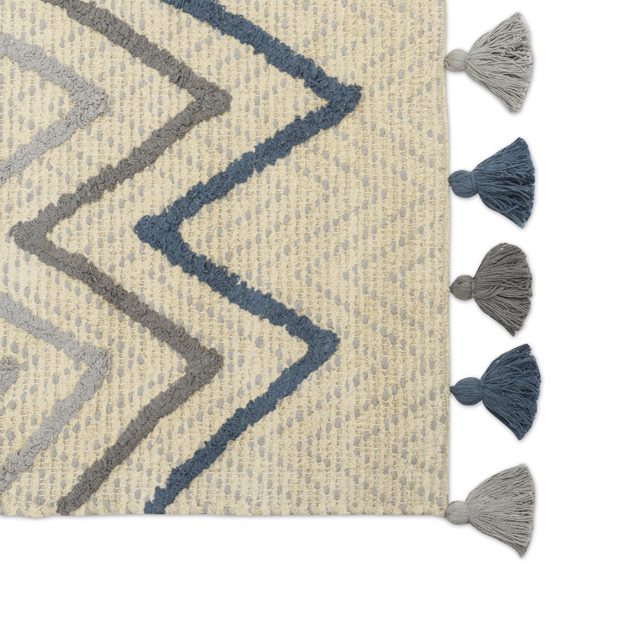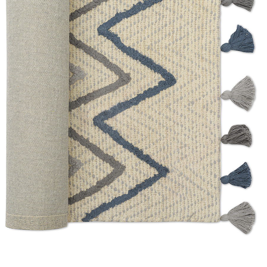 Ковер из хлопка Agra из коллекции Ethnic впишется в любой современный интерьер. Модель украшена кисточками в серо-синей гамме по коротким сторонам. Выразительный зигзагообразный рисунок выткан по принципу градиента и становится более контрастным ближе к краю. Ковер представлен в двух размерах.