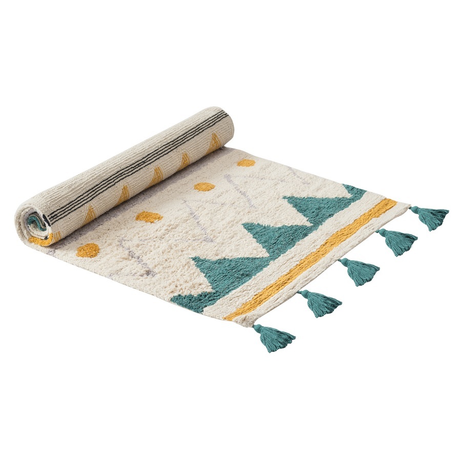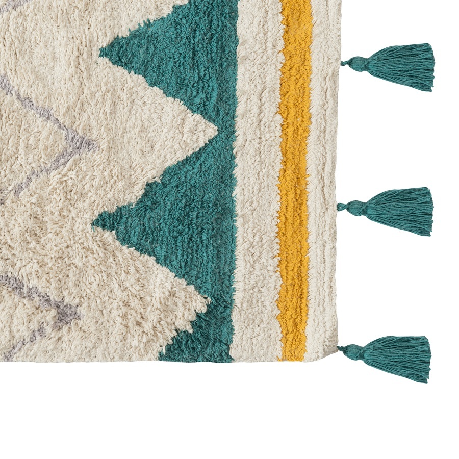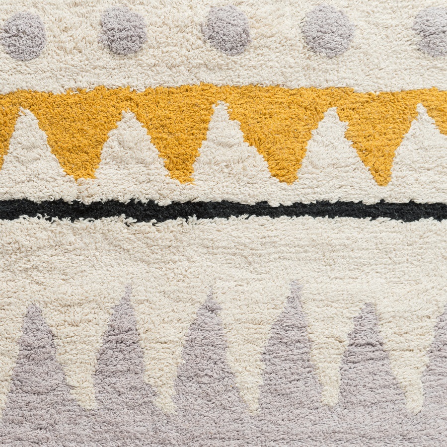 Ковер из хлопка с контрастным этническим орнаментом из коллекции Ethnic украшен кисточками. Он добавит уюта в гостиной, спальне или детской комнате, Особенно хорошо будет смотреться в интерьерах в скандинавском стиле или бохо. Ковер представлен в трех размерах.