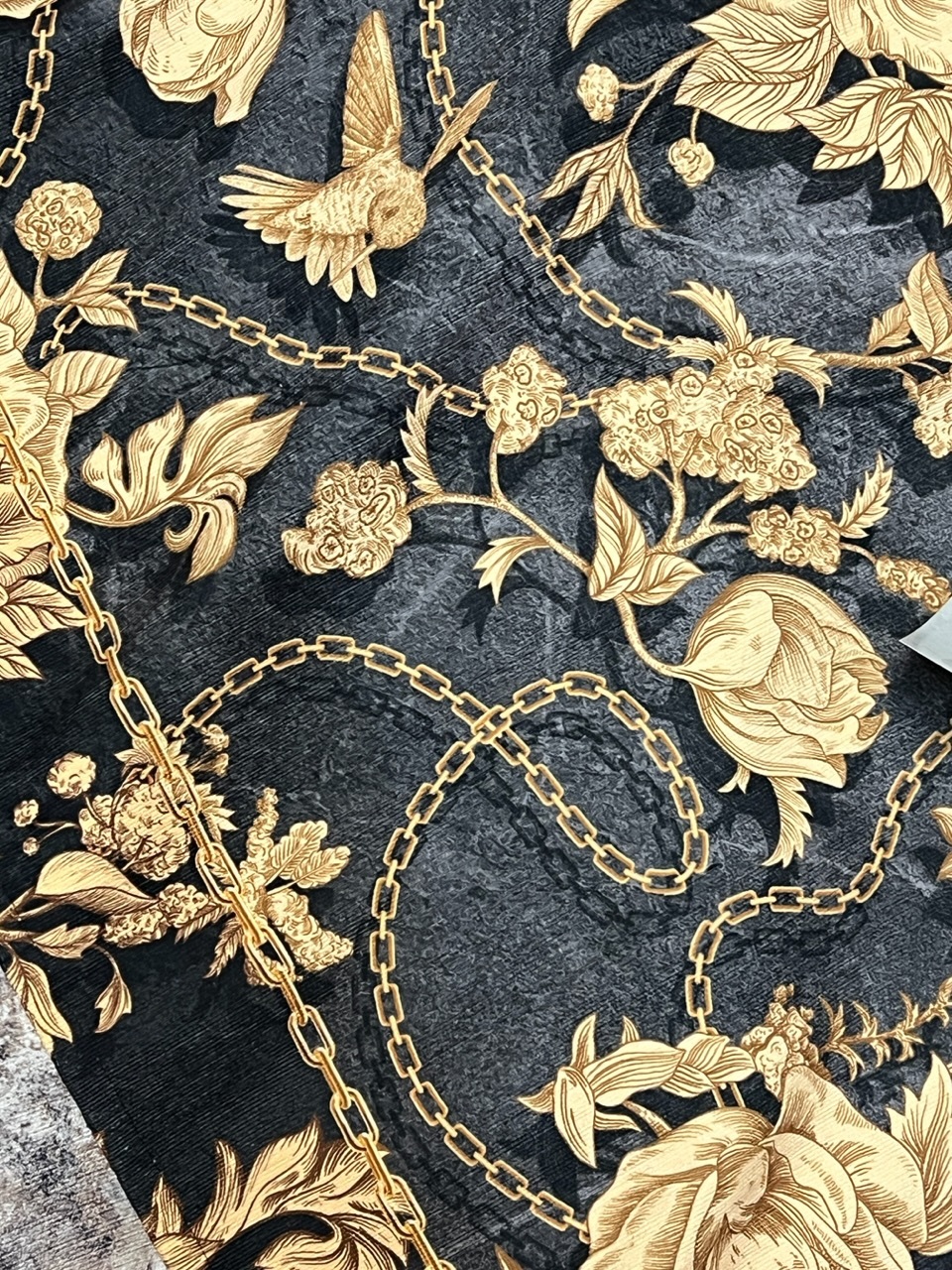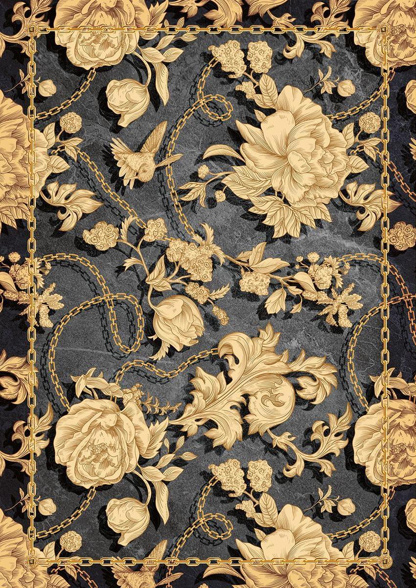 Отголосок огромных золотых залов дворца, современная интерпретация роскошного стиля в классических золотых и серых тонах. Состав: 70 % полиэстер, 25 % хлопок, 5 % другие волокна