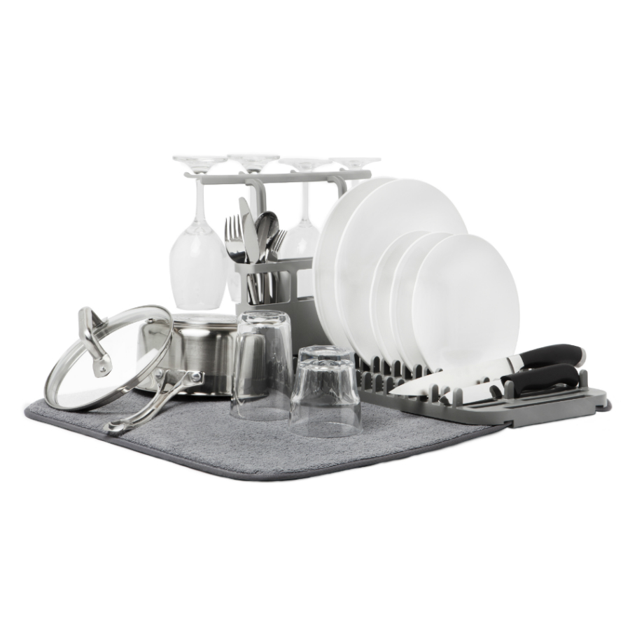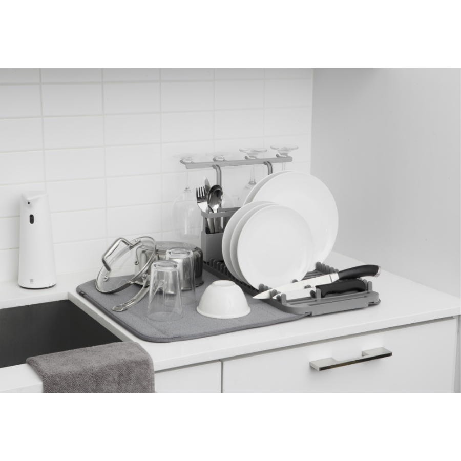 Коврик для сушки посуды Udry – практичный и функциональный девайс от Umbra. Аксессуар гармонично впишется в современный интерьер кухни. Изделие предназначено для сушки тарелок, столовых приборов, чашек и бокалов. Запатентованный дизайн Udry сочетает в себе прочную стойку из формованного пластика и абсорбирующий микрофибровый коврик, который быстро впитывает влагу. Производитель рекомендует мыть девайс вручную или в посудомоечной машине.