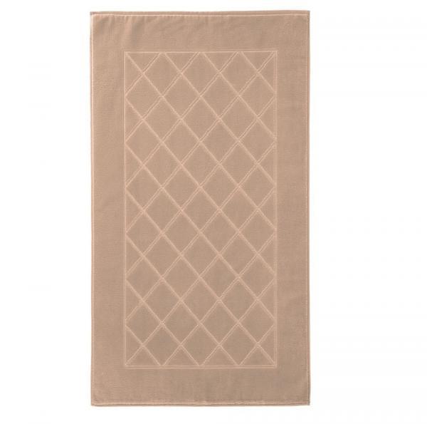 Мягкий красивый коврик в оригинальном исполнении станет истинным украшением ванной комнаты. Коврик светло-коричневого цвета с мягким ворсом выполнен из натурального хлопка. Рисунок в виде прямоугольника, в котором линии пересекаются и образуют ромбы.