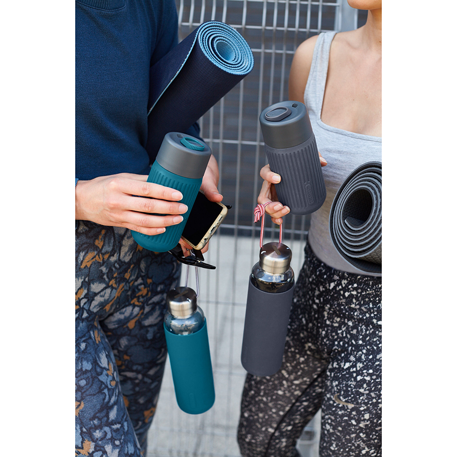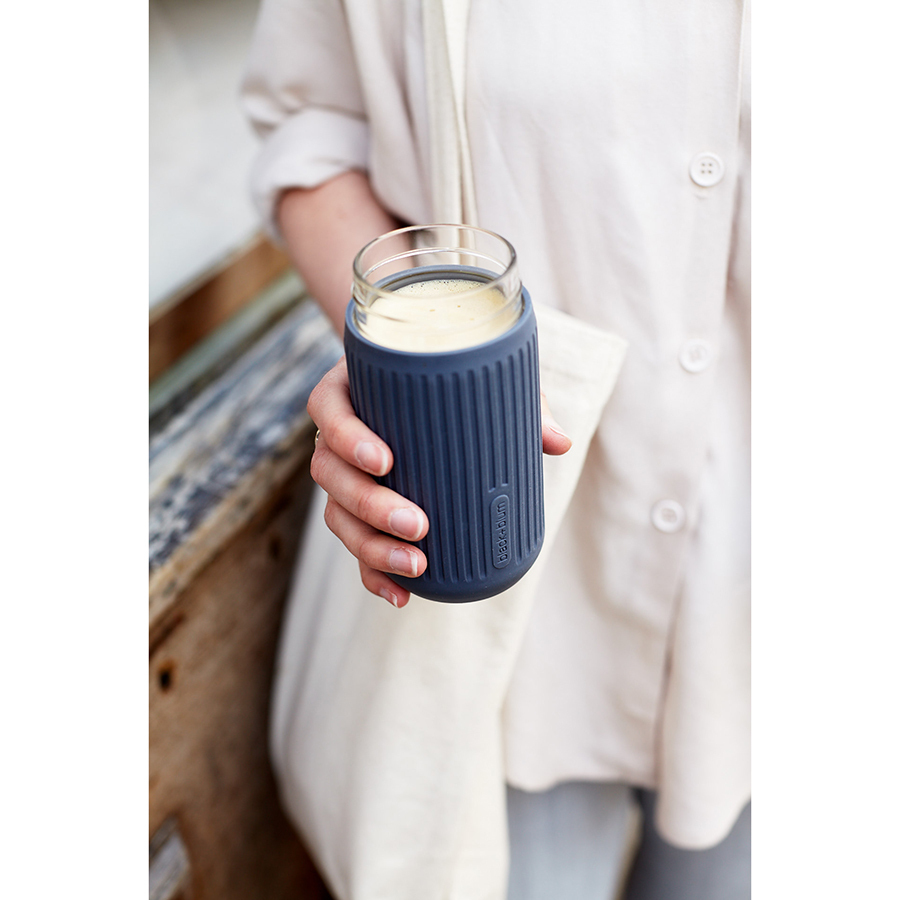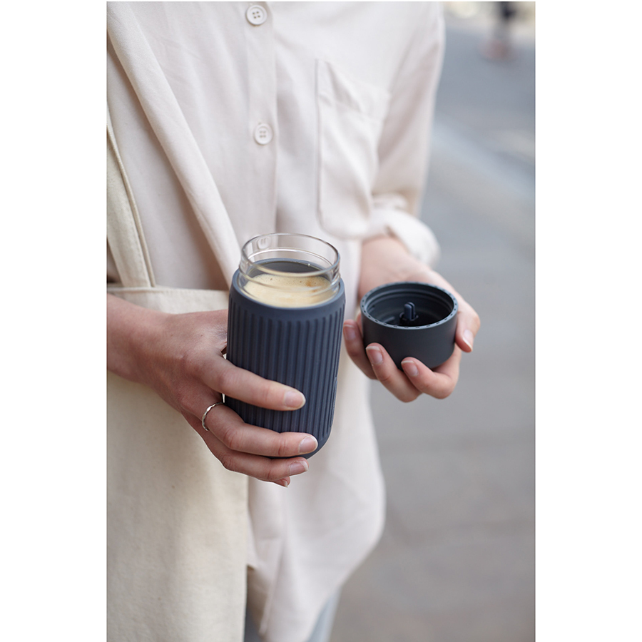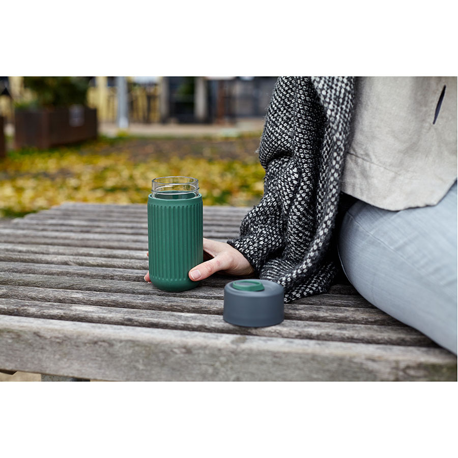 Кружку легко открывать и закрывать одной рукой. Силиконовый чехол защищает емкость из выдувного стекла от повреждений и не скользит. Боросиликатное стекло хорошо удерживает температуру и отличается прочностью. Кружка помещается в велосипедные и автомобильные подстаканники. Она пригодна для газированных напитков. Материал не содержит бисфенола-А и фталатов. Объем: 340 мл.
