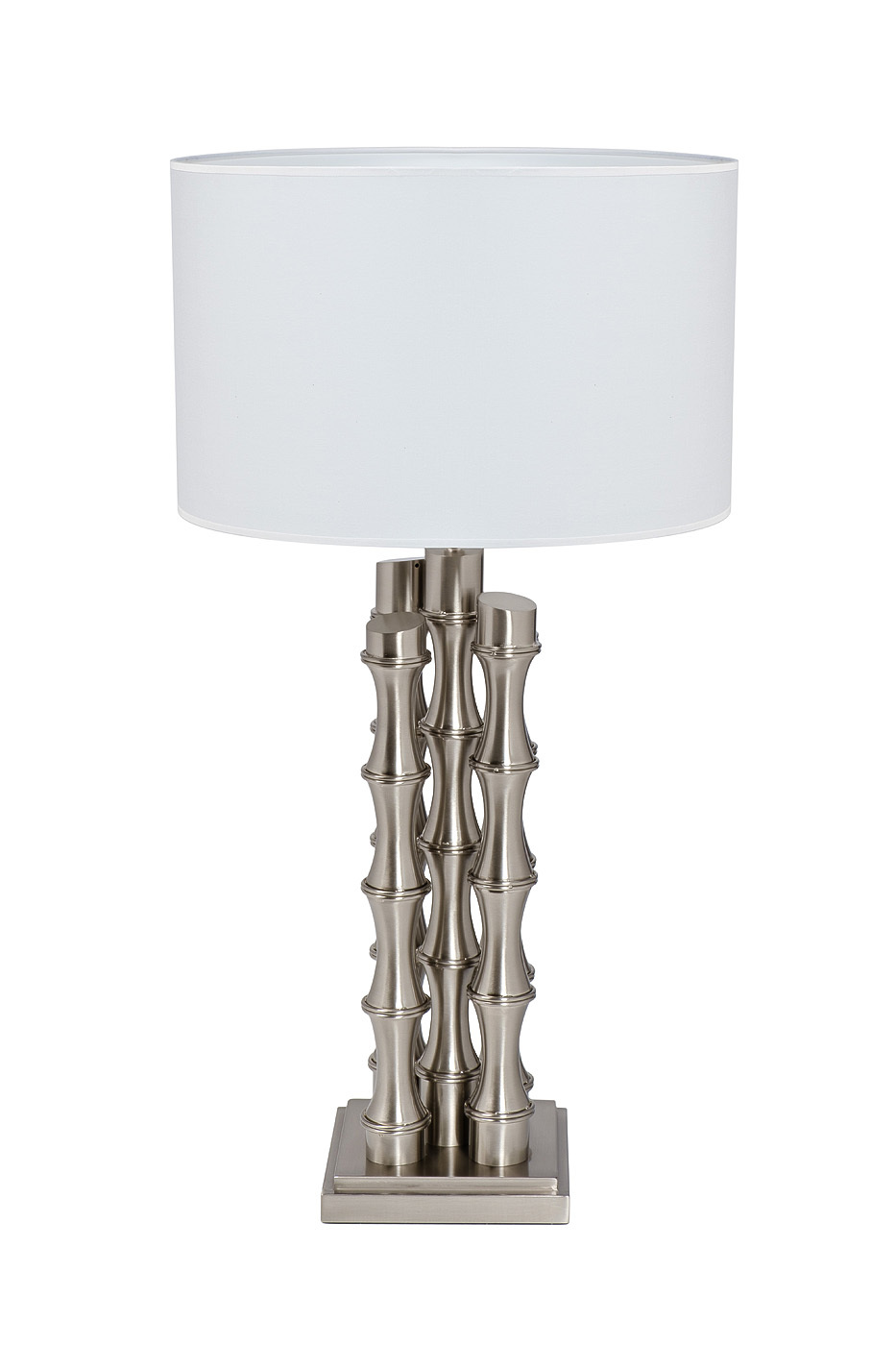 Декоративная настольная лампа Бамбук наравне с функцией освещения выполняет роль самостоятельного арт-объекта. С ее помощью можно расставить декоративные акценты, создать стильную атмосферу, добавить интерьеру эстетики. Необычная настольная лампа сочетает в себе металлическую основу в форме бамбуковых веток и стильный белый абажур из ткани. Классическое цветовое сочетание блестящий металл + матовый текстиль делает этот светильник идеальным для современных интерьеров. Если нужна красивая настольная лампа для спальни или гостиной, данная модель будет отличным выбором.