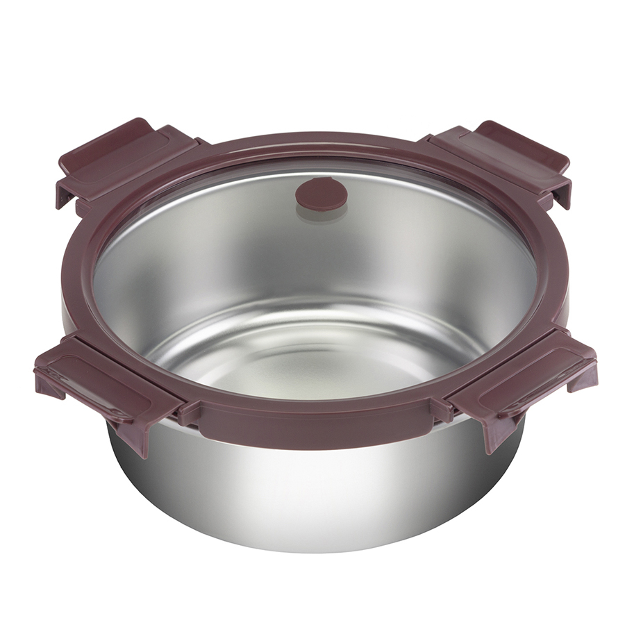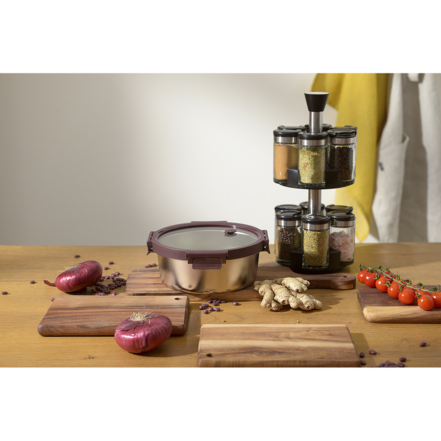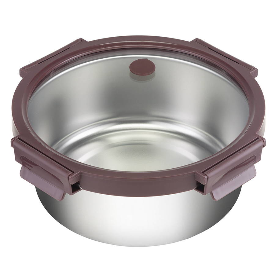 Ланч-бокс из нержавеющей стали – стильная, практичная и надежная посуда для хранения и транспортировки еды. Материал не подвержен коррозии, не впитывает запахи и загрязнения, долго сохраняет привлекательный вид. Крышка из прочного боросиликатного стекла легко выдерживает перепады температуры, имеет специальные фиксаторы, которые помогают избежать протечек. Наличие вентиляционного отверстия позволяет выпустить из контейнера лишний воздух или горячий пар, что повышает герметичность и улучшает условия хранения продуктов. Благодаря компактным размерам емкость не занимает много места в сумке. Ланч-бокс можно смело брать с собой на работу, в поездку или путешествие.