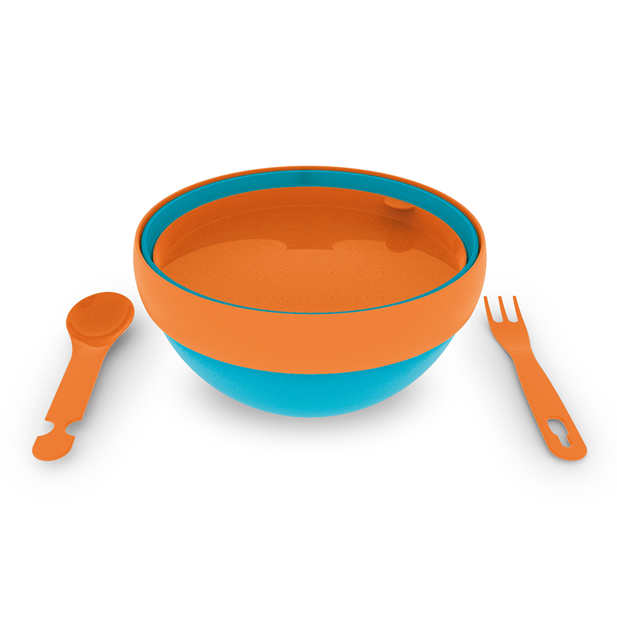 Он состоит из двух герметичных и вместительных чаш с крышкой, между которыми помещаются столовые приборы и охлаждающий элемент с отверстием для йогурта в центре. При желании пластиковые вилка и ложка соединяются в удобные щипцы для салата.