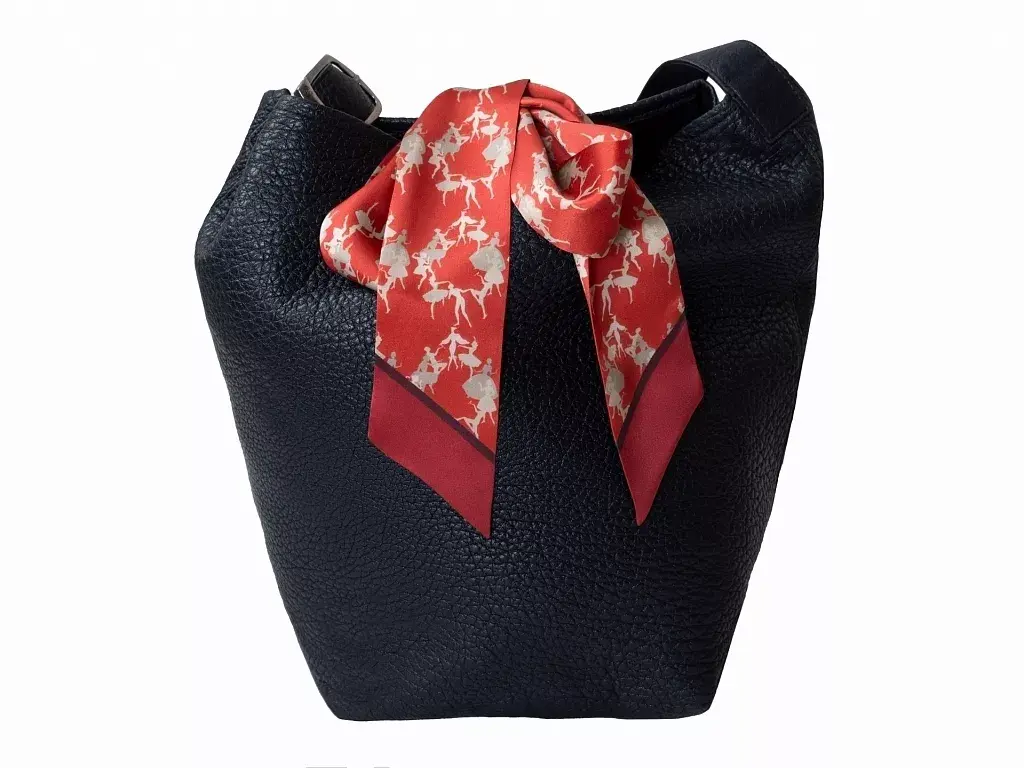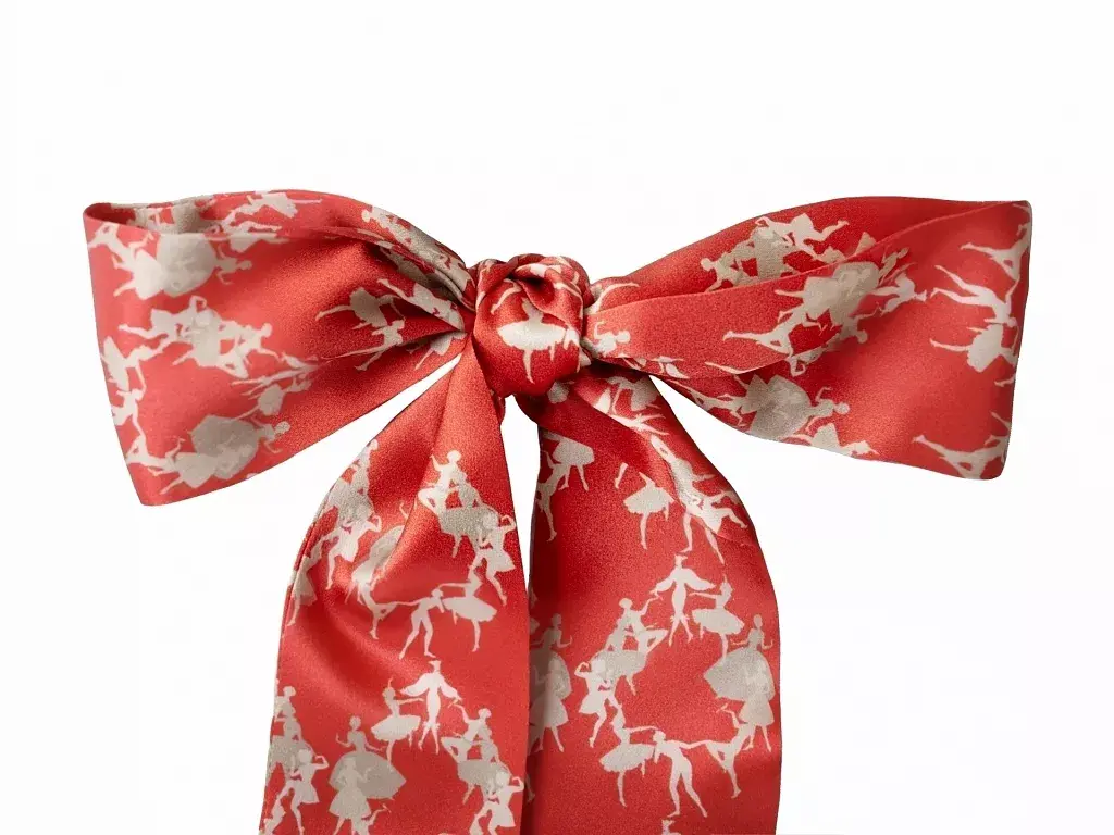 Аксессуар двусторонний, так что неприглядной изнанки попросту нет. Лента сделана из натурального шелка и прокрашена итальянскими красителями в технике цифровой печати. Размер универсальный — 145 х 7 сантиметров. Край срезан косо и окрашен в насыщенный красный, что придает аксессуару динамичность.
