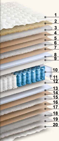 - Пружинный блок, состоящий из 7 зон несущей способности для различных точек опоры. Для двуспальной кровати - около 850 закалённых биконусных пружин, изготовленных из стальной проволоки диаметром 1,8 мм., самоподстраивающиеся, каждая независимая пружина находится в отдельном тканевом чехле.