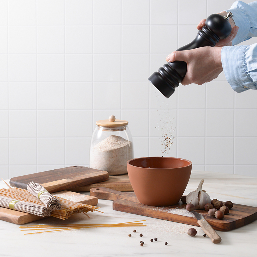 Мельница для перца в элегантном дизайне поможет во время готовки любимых блюд и украсит стол.