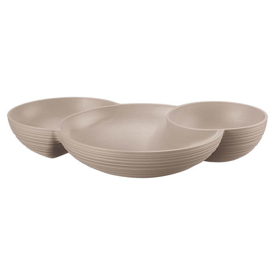 Тройная менажница из переработанного пластика с фактурой, имитирующей глину, подойдет для подачи закусок и снеков.Менажница произведена из 8,5 переработанных пластиковых бутылок. Материал безопасен для здоровья.