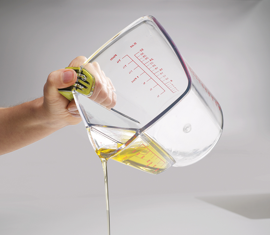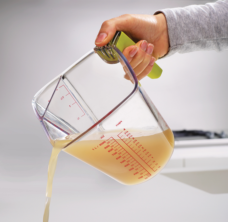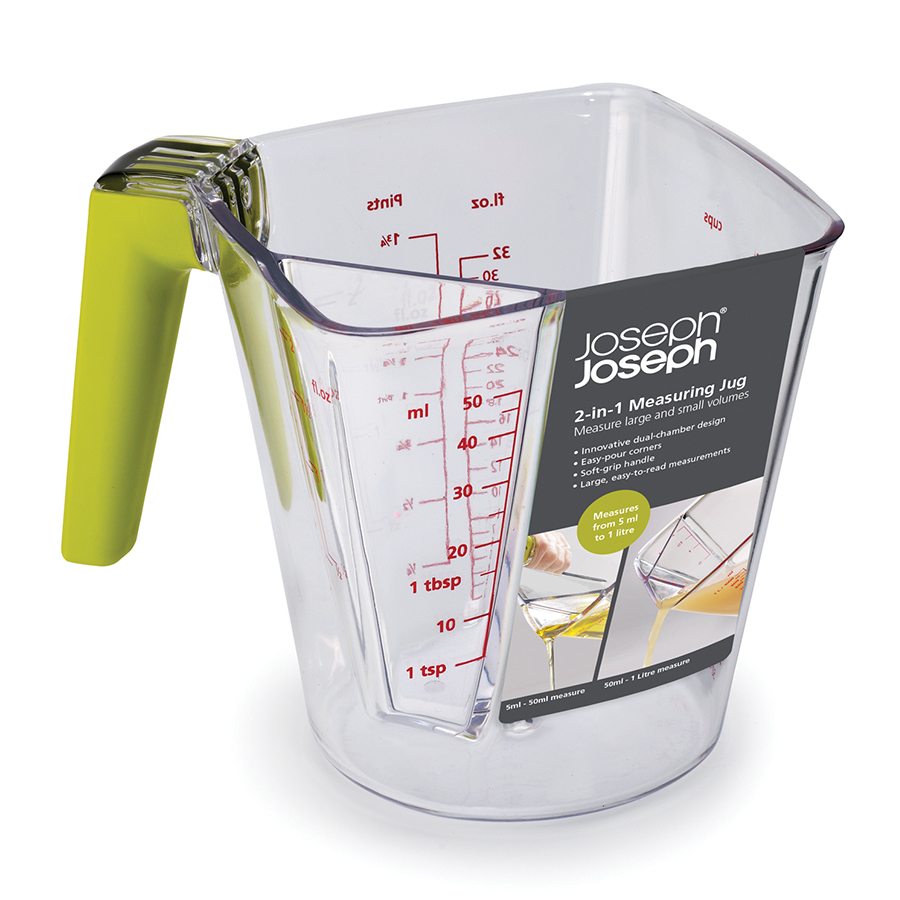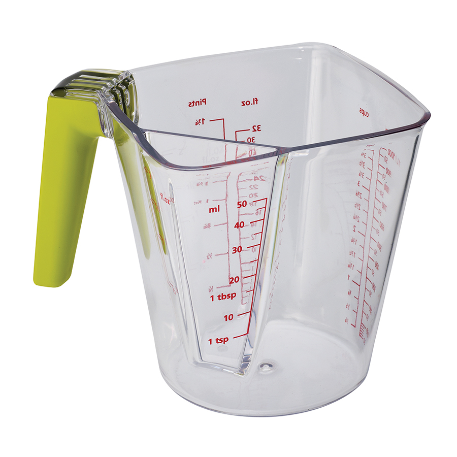 Универсальный стакан с двумя отделениями для измерения жидкостей как малых объемов от 5 мл до 1 литра. Благодаря прямым углам жидкости очень удобно переливать, а мягкая силиконовая ручка обеспечивает дополнительный комфорт.