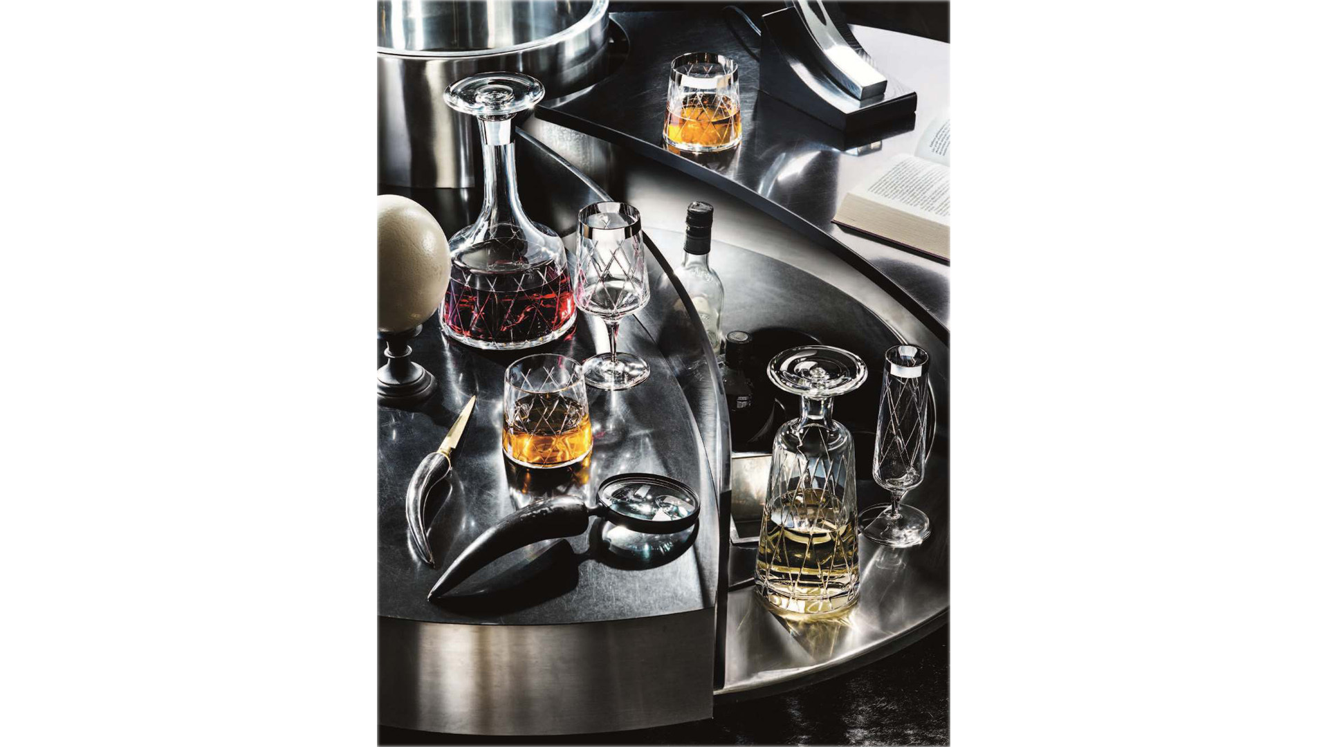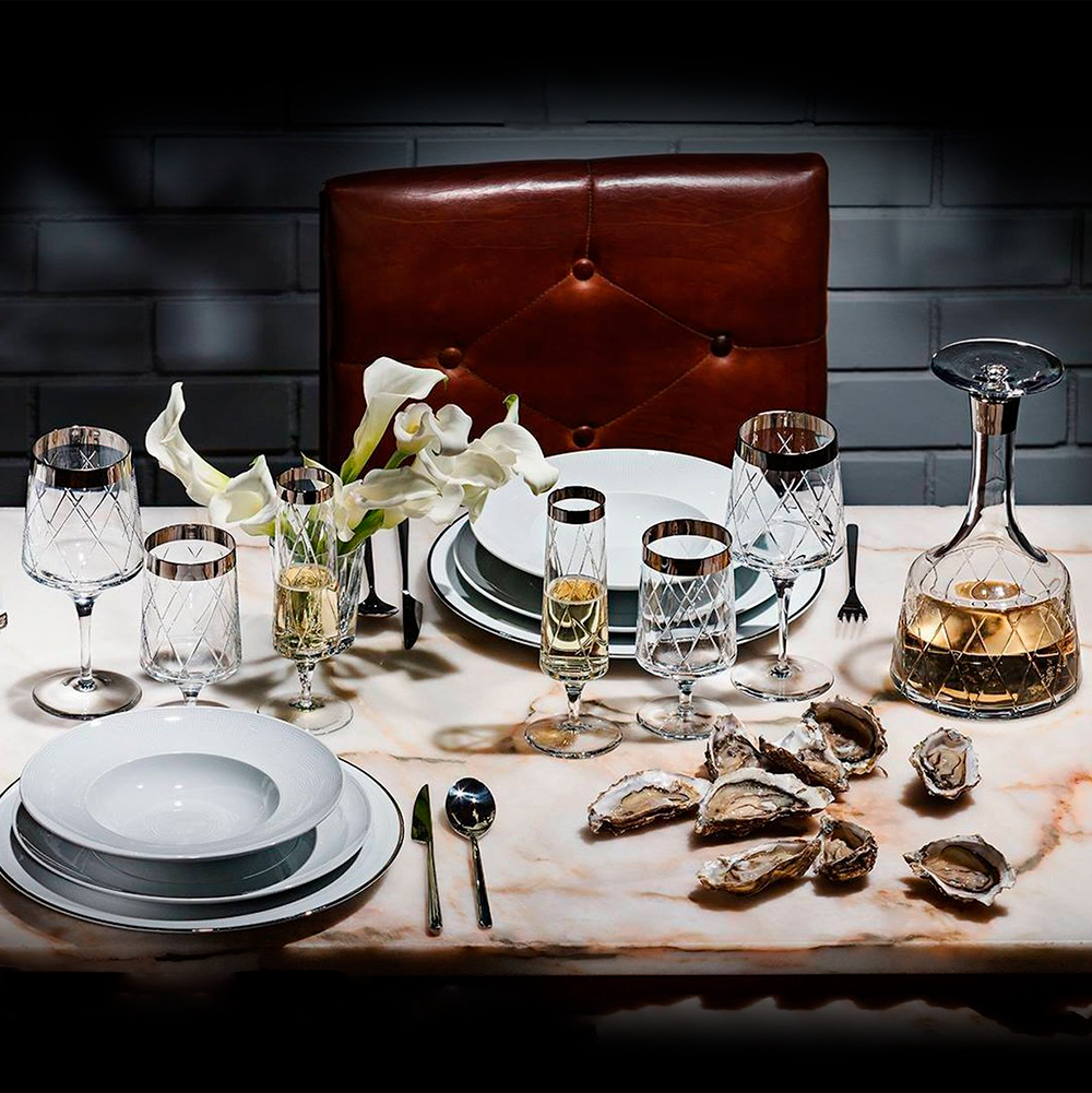На поверхность каждого предмета нанесена сетка из тончайших линий изысканного гранения ручной работы. Подобная отделка придает им особенный шарм и наполняет содержимое волшебной игрой световых бликов. Довершает образ роскоши и великолепия отделка из платины вдоль ободка, которая становится заключительным штрихом в общей картине декорирования.