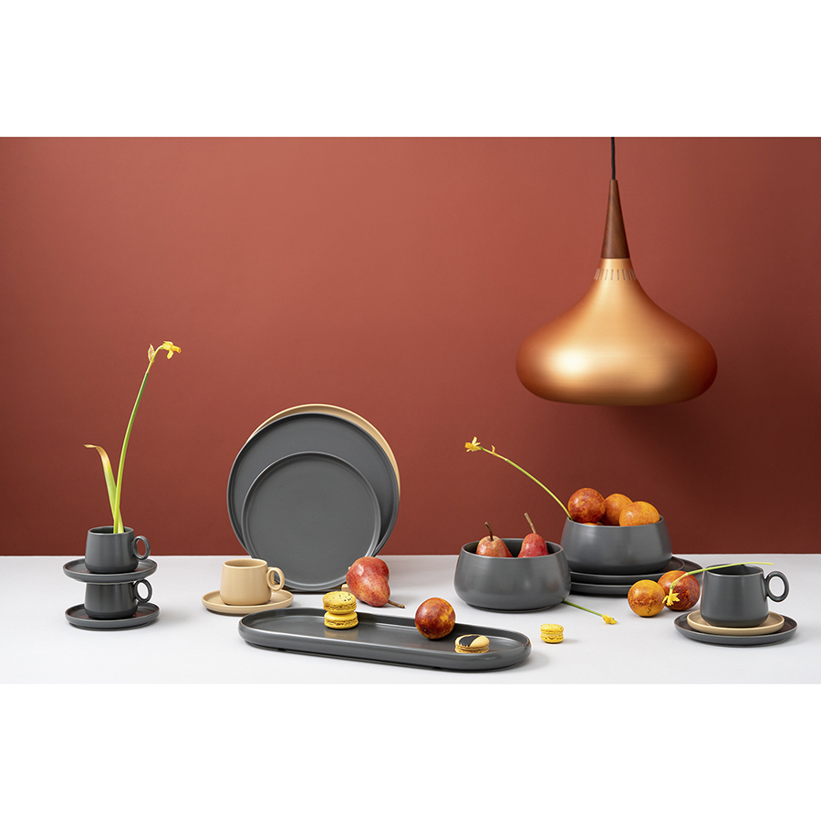 Набор из двух фарфоровых чайных пар глубокого серого цвета подойдет как для праздничной сервировки, так и для ежедневного чаепития. Сдержанный скандинавский дизайн чашек и блюдец станет украшением вашей кухни, а необычная форма будет радовать каждый день. Гладкая фарфоровая поверхность с приятным, чуть приглушенным глянцем благородно выглядит и вместе с тем очень практична — не царапается и легко отмывается от загрязнений. Чайные пары можно дополнить другими предметами из серии Essential — например, тарелками, блюдами и салатниками.