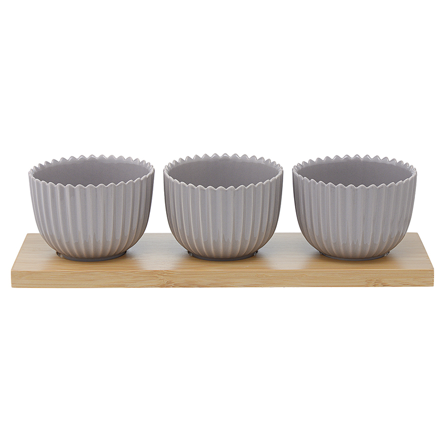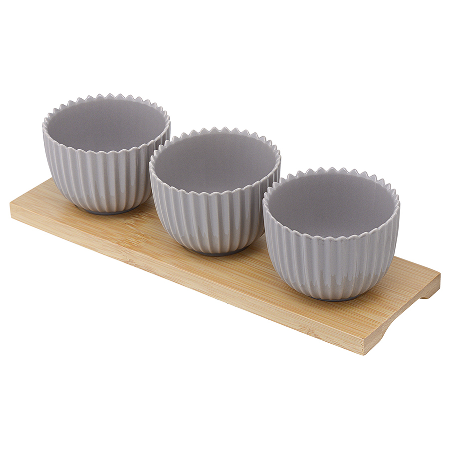 Набор для сервировки состоит из трех фарфоровых чаш насыщенного темно-серого цвета и подставки из полированного бамбука. Такой набор идеально подойдет для подачи закусок, соусов или сладостей к праздничному столу или семейному ужину. Глянцевая фарфоровая поверхность чаш имеет рифленую фактуру, что добавляет сервировке легкости и утонченности. При этом чаши очень практичны: не царапаются, не меняют цвет и легко моются. Этот набор прекрасно сочетается с другой посудой из коллекции Edge, в которой есть тарелки, чашки, салатники, сахарницы и другие предметы.