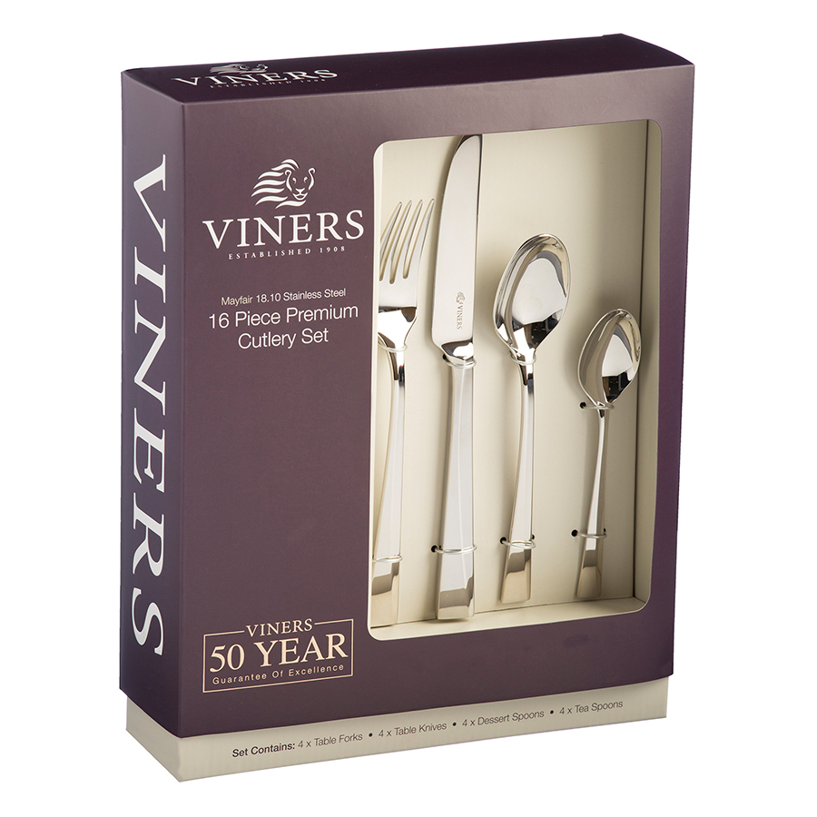 Mayfair — коллекция столовых приборов из нержавеющей стали 18.10, которая производится по самым высоким стандартам качества. Непреходящая элегантность гармонично сочетается с эргономичной формой рукояток. Приборы устойчивы к коррозии, ржавчине и окислению. Плавные линии, утончённый дизайн и благородный оттенок сделают эту коллекцию эффектным акцентом сервировки. Бренд Viners даёт гарантию на колекцию 50 лет.