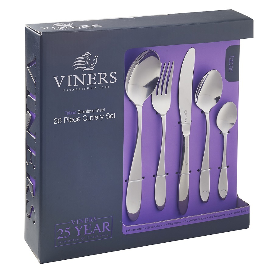 Tabac — коллекция столовых приборов из нержавеющей стали 18.0, которая производится по самым высоким стандартам качества. Плавные линии и классическая форма приборов подчеркнут элегантность сервировки. Приборы устойчивы к коррозии, ржавчине и окислению. Бренд Viners даёт гарантию на коллекцию 25 лет.