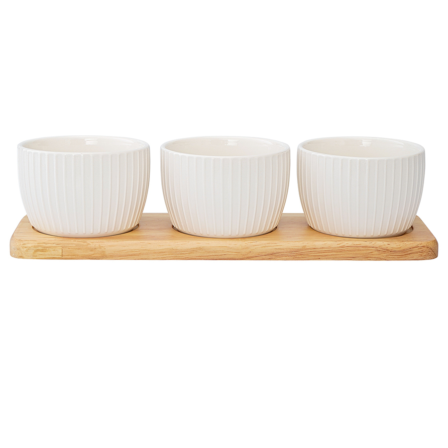Материал: чаши – фарфор, поднос – бамбук. Диаметр чаш: 8 см. Размеры подноса: 28,1х9х6,3 см. Цвет чаш: белый.