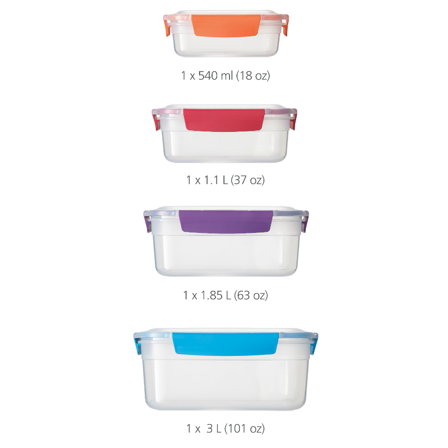 В набор входят контейнеры 4-х разных объемов: 1,85 л, 1,1 л, 540 мл и 230 мл.