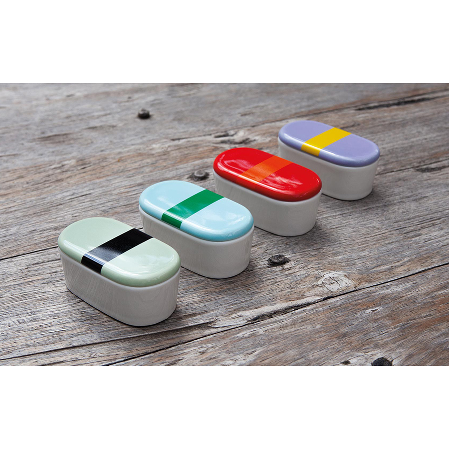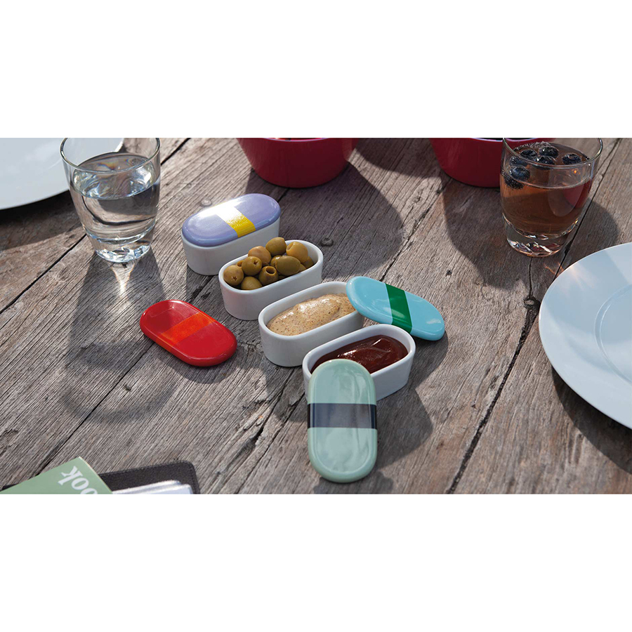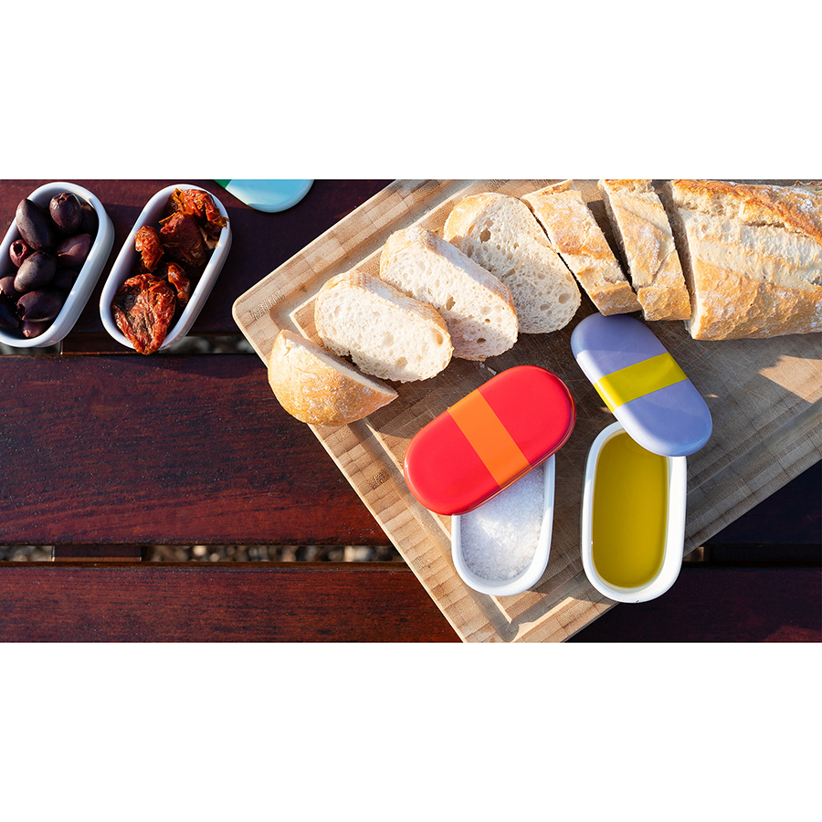 Контейнеры подходят для соли, масла, соусов, специй и многого другого. Крышки разных цветов не дадут перепутать емкости. Они выполнены из высококачественного фарфора. Размер одного контейнера ВхШхГ: 3,7х4,9х9,2 см