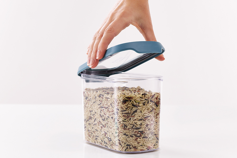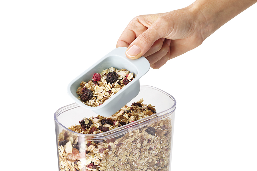 К крышке большого контейнера прикреплен удобный совок объемом 125 мл. С его помощью можно легко отмерить необходимое количество овсяных хлопьев, сухофруктов, сахара и других продуктов.