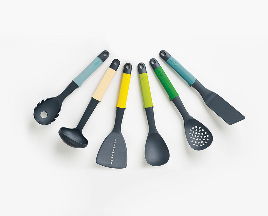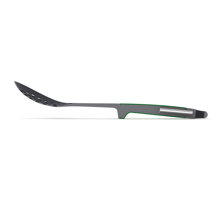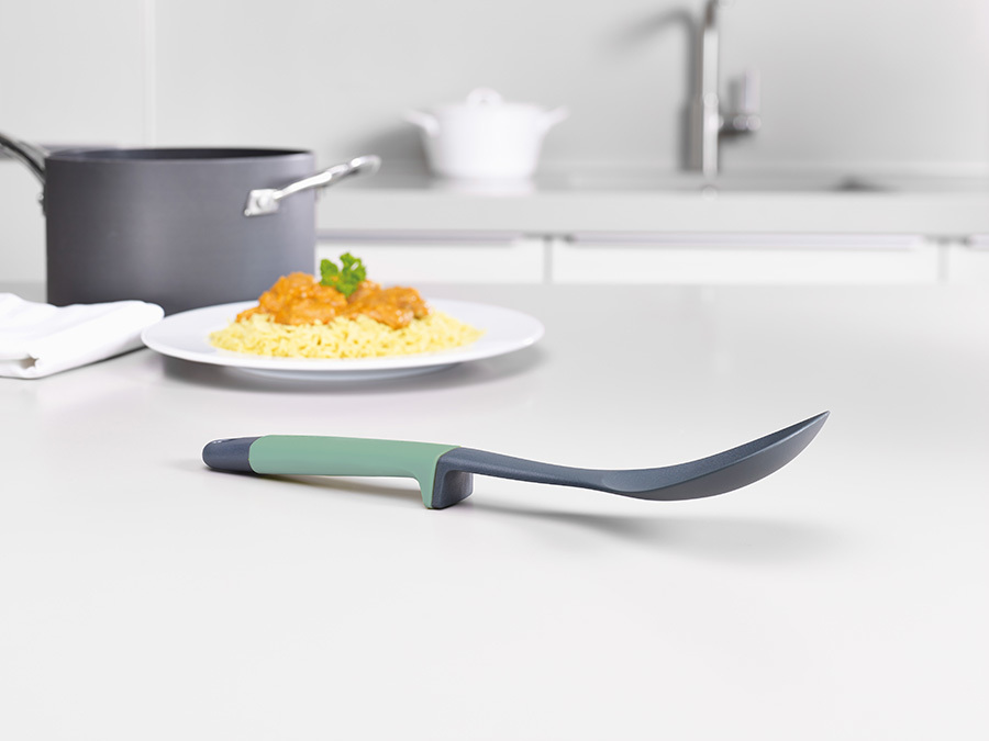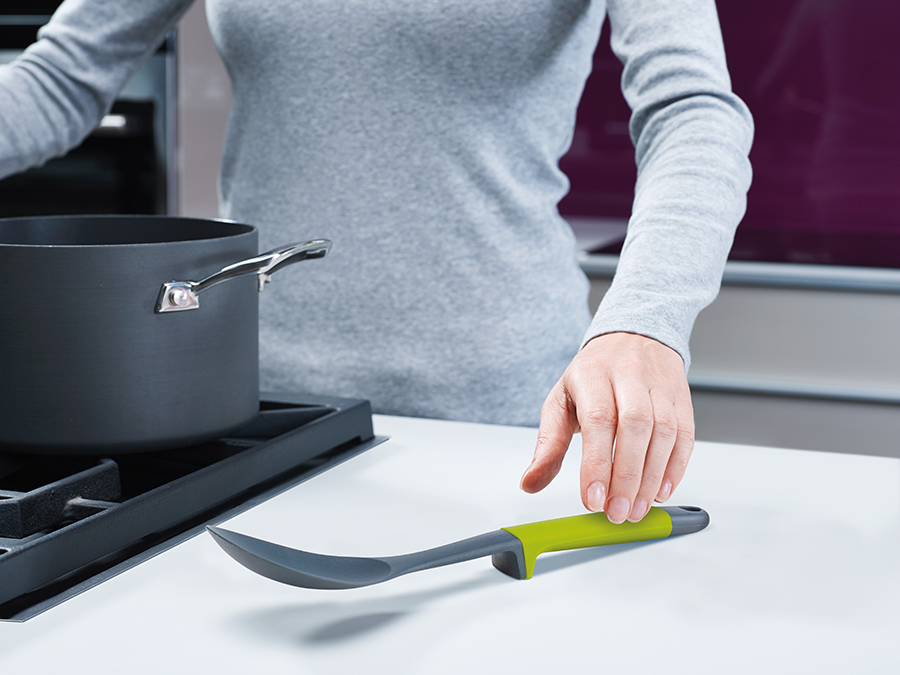 Входит в серию кухонных приборов Elevate™ , разработанную с целью минимизировать беспорядок во время готовки. Каждый прибор оснащен инновационной утяжеленной ручкой, благодаря которой испачканная часть инструмента всегда остается навесу и не касается рабочей поверхности.