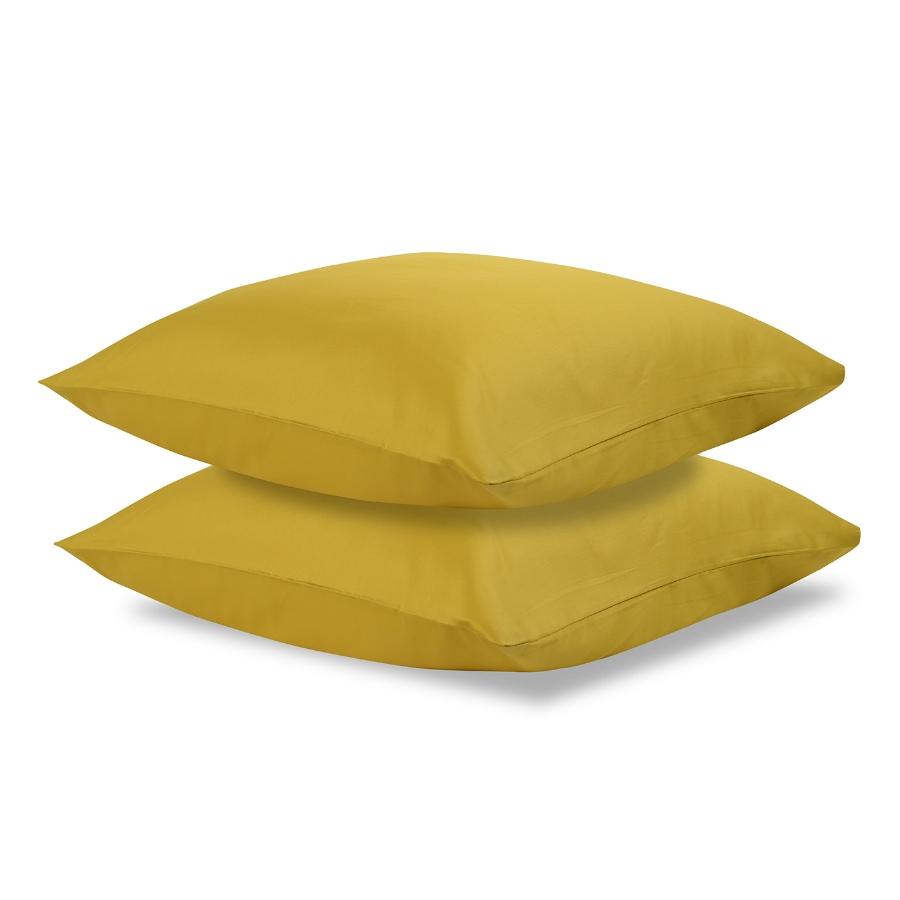Комплект из двух однотонных наволочек горчичного цвета выполнен из гладкого хлопкового сатина. Прочный, приятный на ощупь материал с характерным блеском не электризуется и не вызывает аллергию