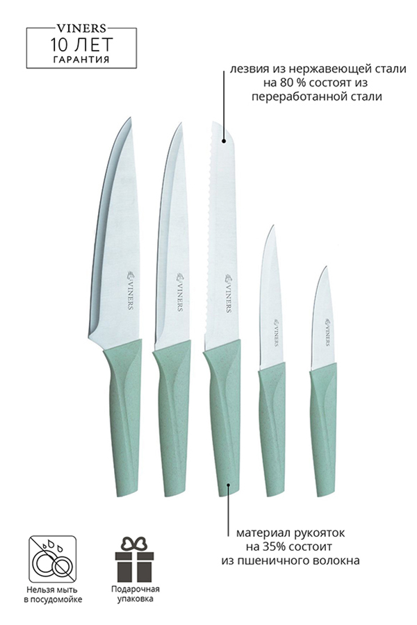 Производитель рекомендует только ручное мытье. Бренд Viners дает гарантию 10 лет на все кухонные ножи.