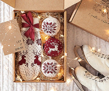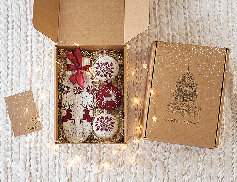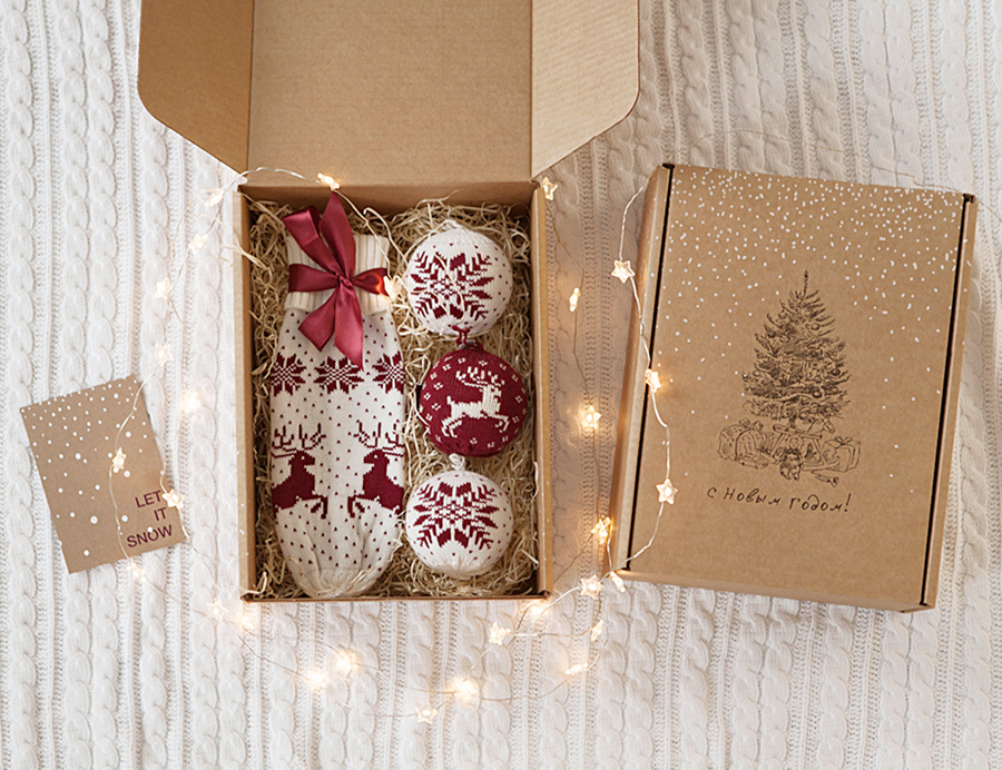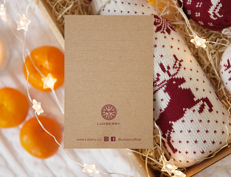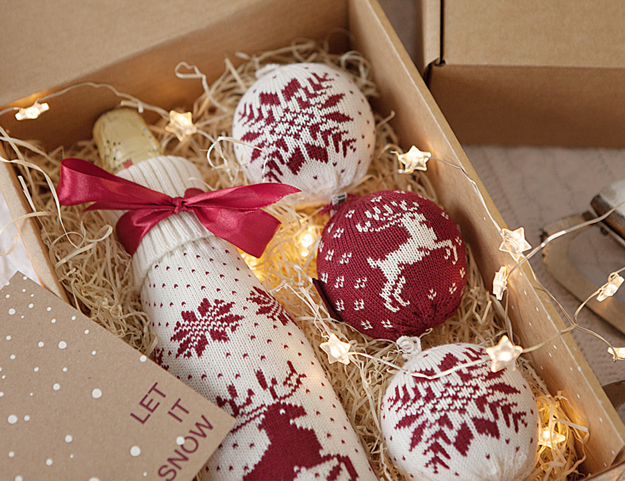 В новогоднюю подарочную коробку Luxberry Box входят три фирменных вязаных шарика на елку, чехол на бутылку шампанского и открытка Let It Snow. Коробка расчитана под размер бутылки.