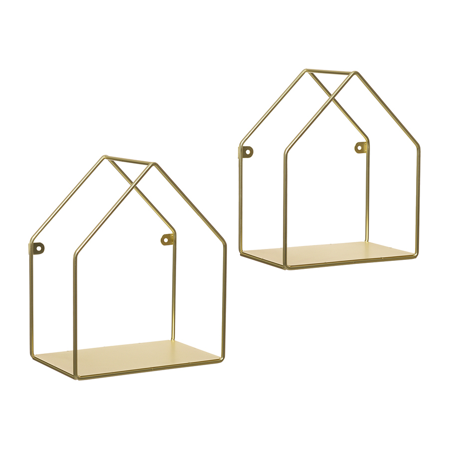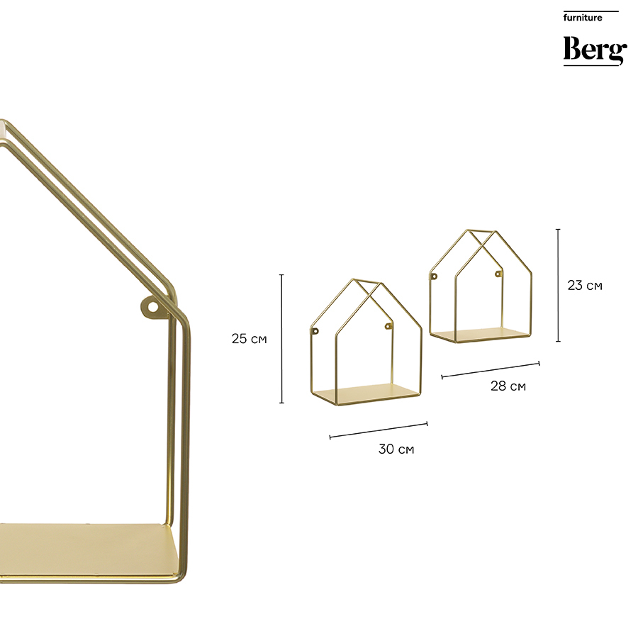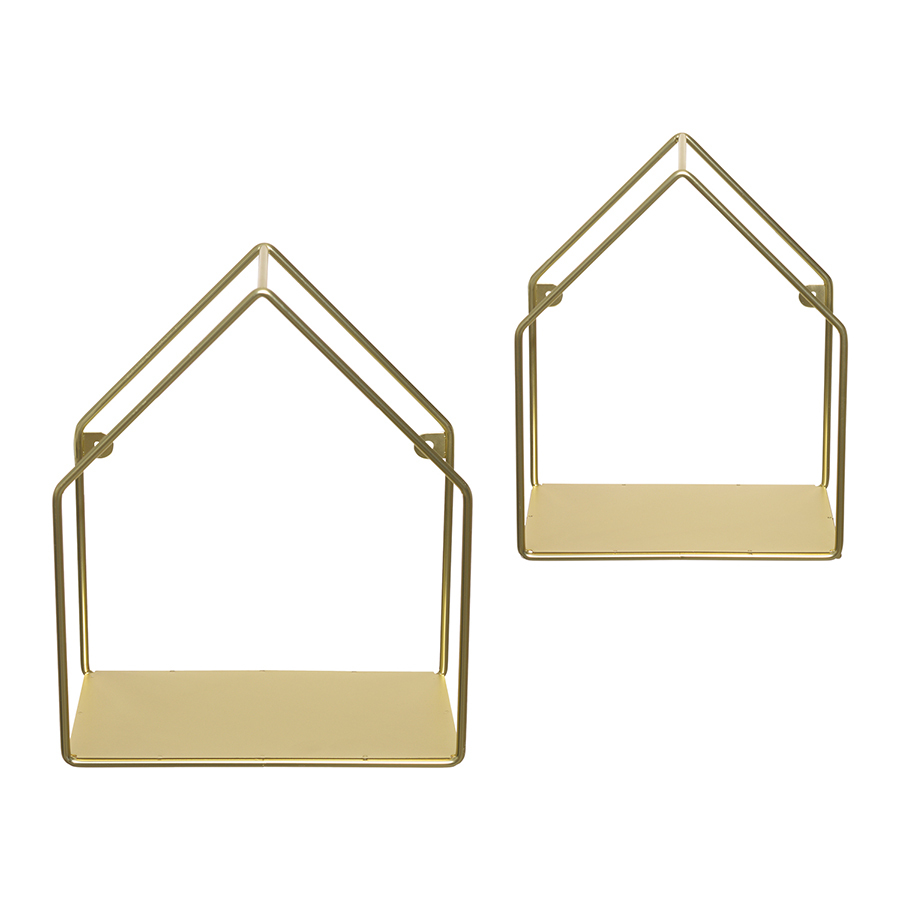Набор настенных полок Cenci, выполненный в современном минималистическом стиле, идеально подойдет для любого современного интерьера. Каркасы изделий изготовлены из прочной стальной проволоки с отделкой под золото. Основаниями служат прямоугольные металлические пластины, окрашенные в цвет каркаса, на которые можно поставить горшки с комнатными растениями, книги или сувениры. Прочные стальные конструкции не занимают много места и подвешиваются прямо на стены в прихожих, спальнях или любых других комнатах. В комплект входят две полки.