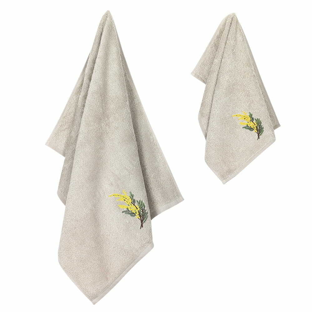 Набор из двух полотенец Arya, модель Centaury в бежевом цвете. Размеры полотенец 30X50 и 50X90 см. Полотенца изготовлены из бамбука с добавлением хлопка. На полотенцах вышивка в виде веточек ели и мемозы.