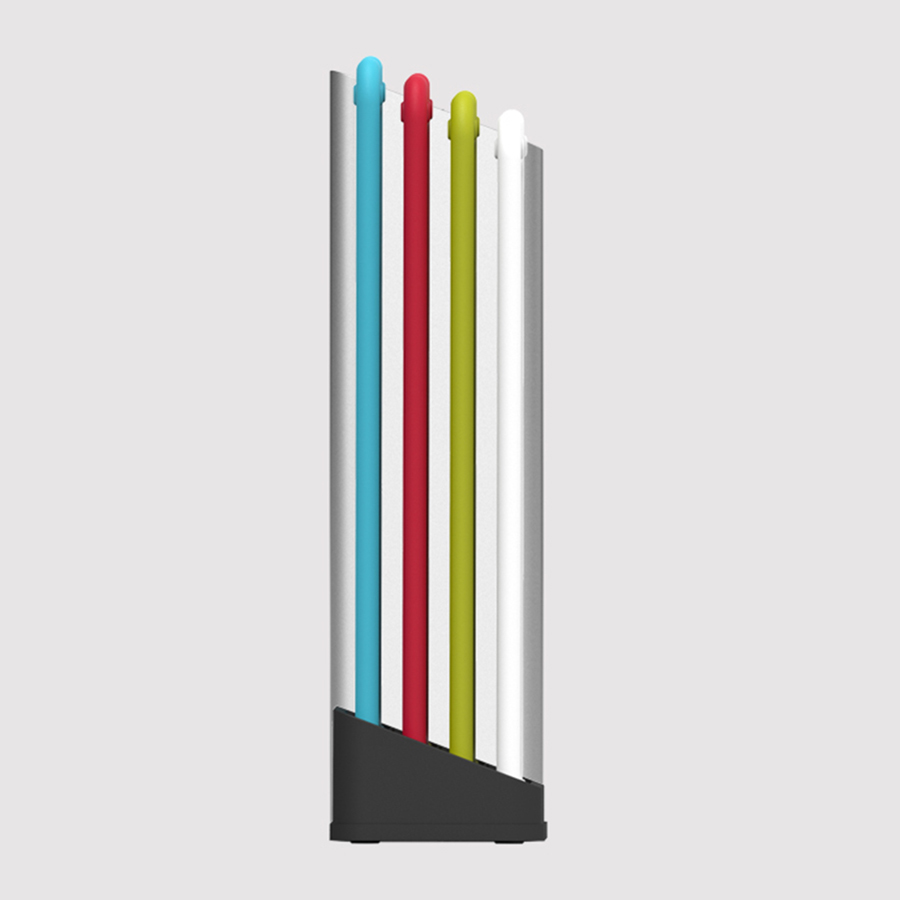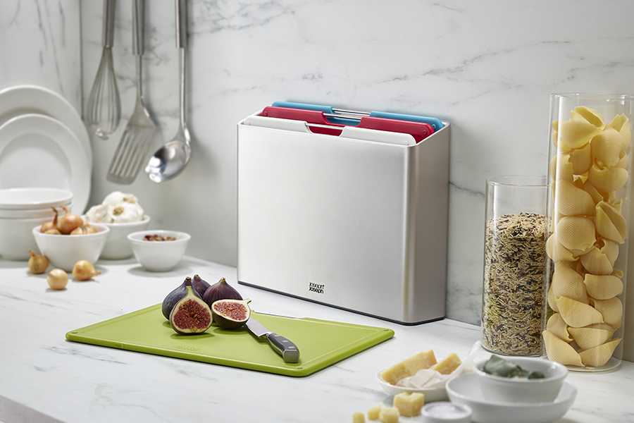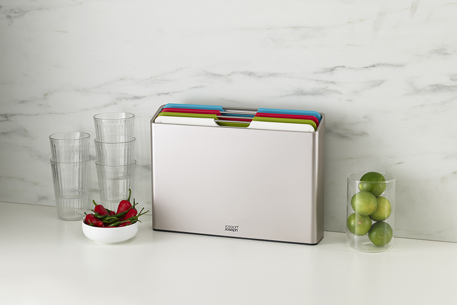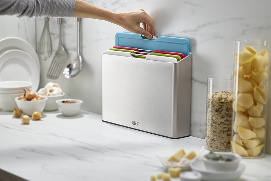 Пластиковый кейс для хранения занимает мало места и вписывается в любой интерьер кухни. Подставка удерживает аксессуары на расстоянии, позволяя воздуху равномерно циркулировать между ними. Доски можно мыть в посудомоечной машине. Подставку следует протирать влажной тканью.