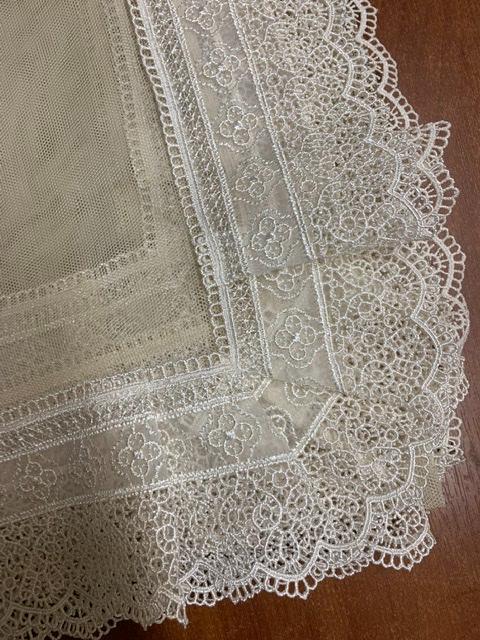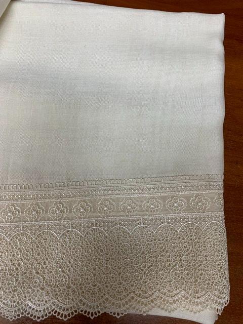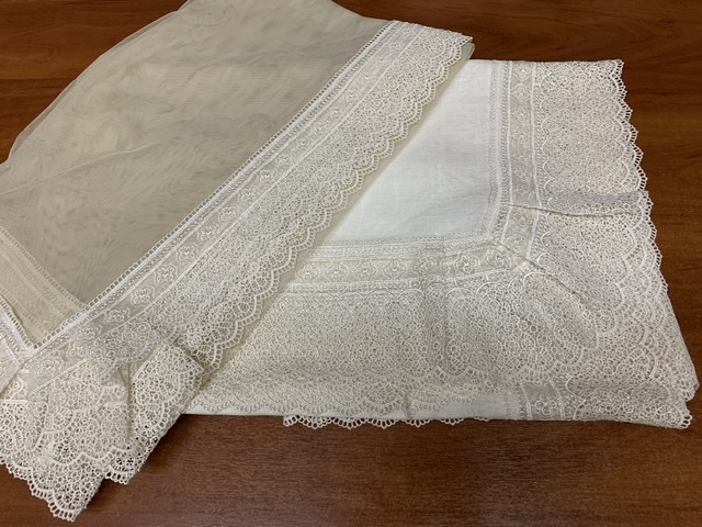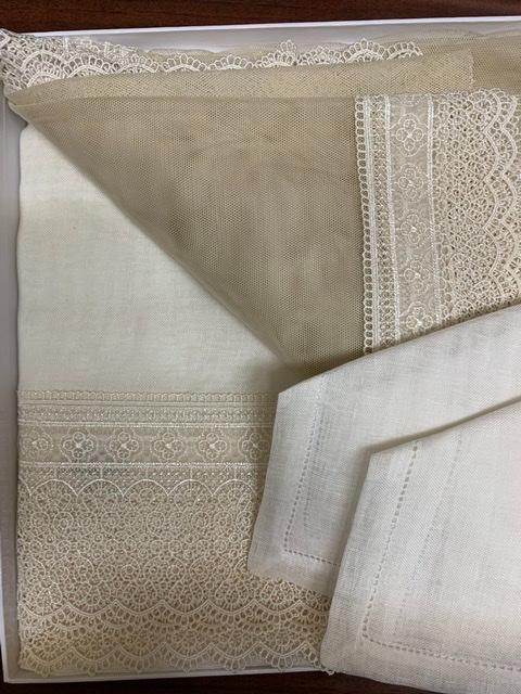 Нижняя скатерть изготовлена из 100% высококачественного льна верхняя скатерть из полиэстера с обработкой кружевом по всему периметру.