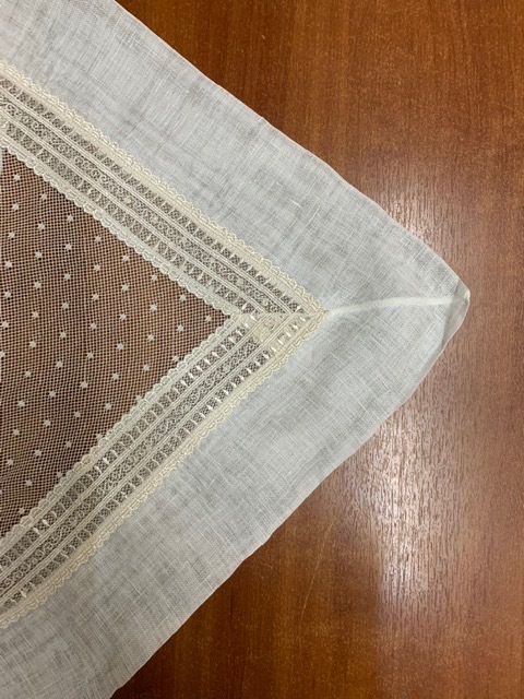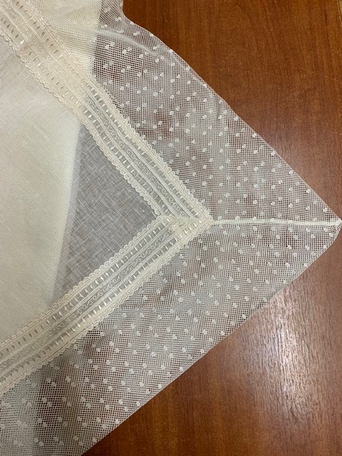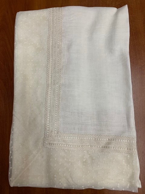 Нижняя скатерть изготовлена из 100% высококачественного льна верхняя скатерть из полиэстера с обработкой кружевом по всему периметру.