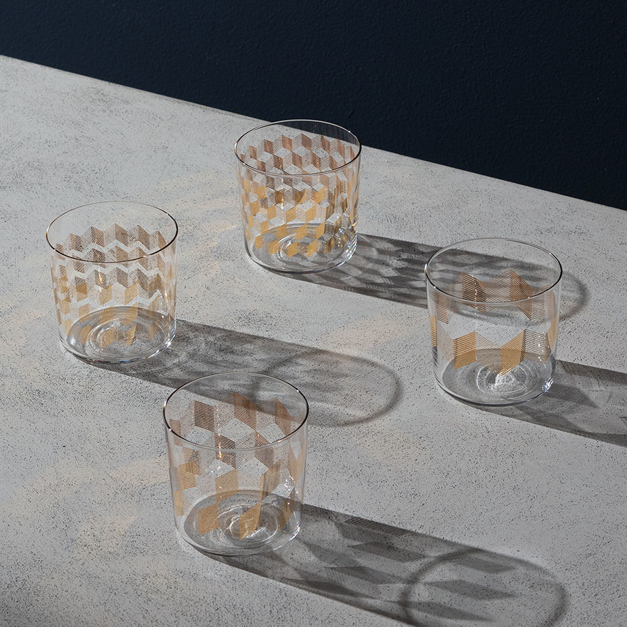 В набор входят 4 стакана из выдувного стекла, украшенные золотистым орнаментом, нанесенным вручную.