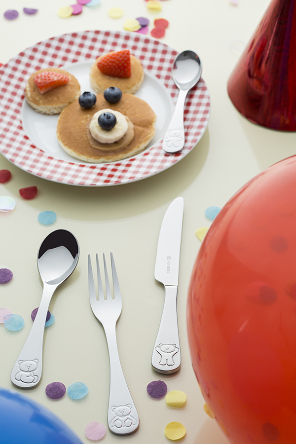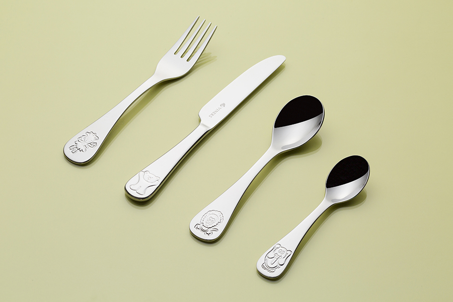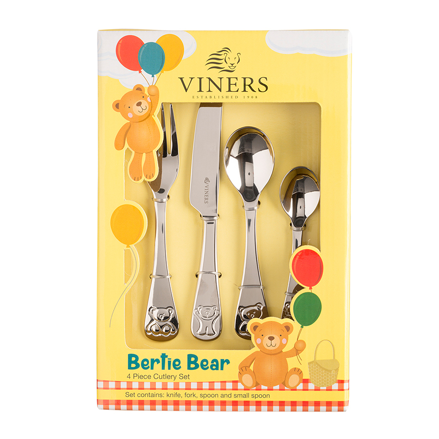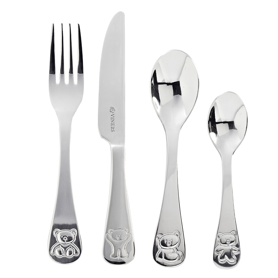 Набор из 4 столовых приборов: нож, вилка, столовая ложка и чайная ложка. Можно мыть в посудомоечной машине. Набор упакован в красивую коробку и станет отличным подарком малышу.