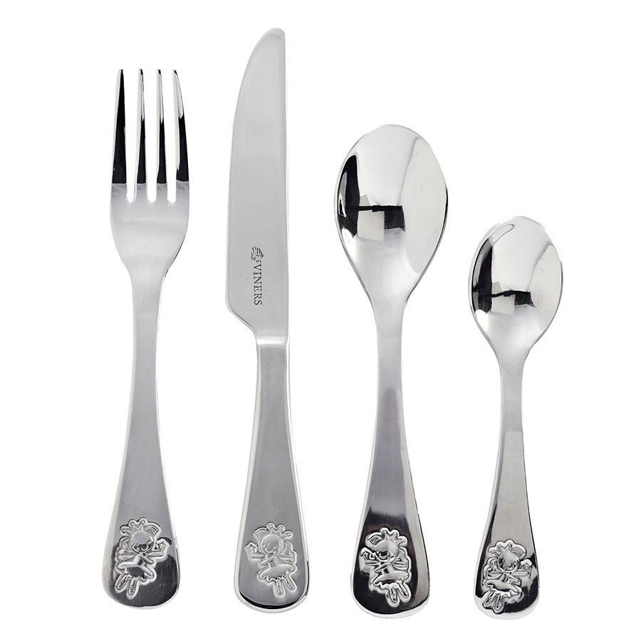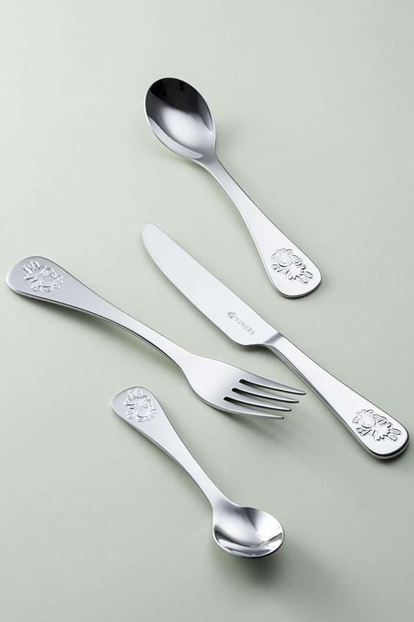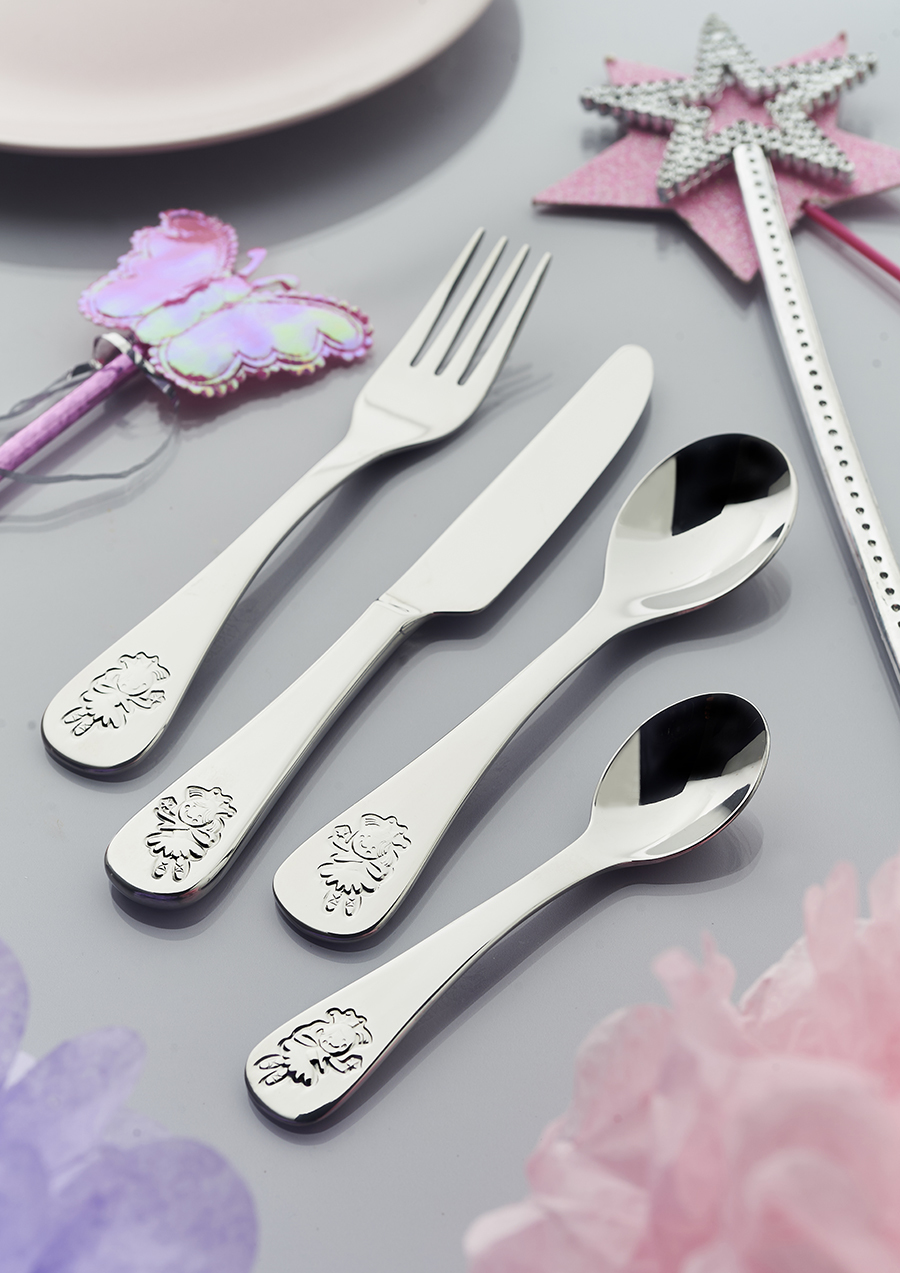Набор из 4 столовых приборов: нож, вилка, столовая ложка и чайная ложка. Можно мыть в посудомоечной машине. Набор упакован в красивую коробку и станет отличным подарком малышу.