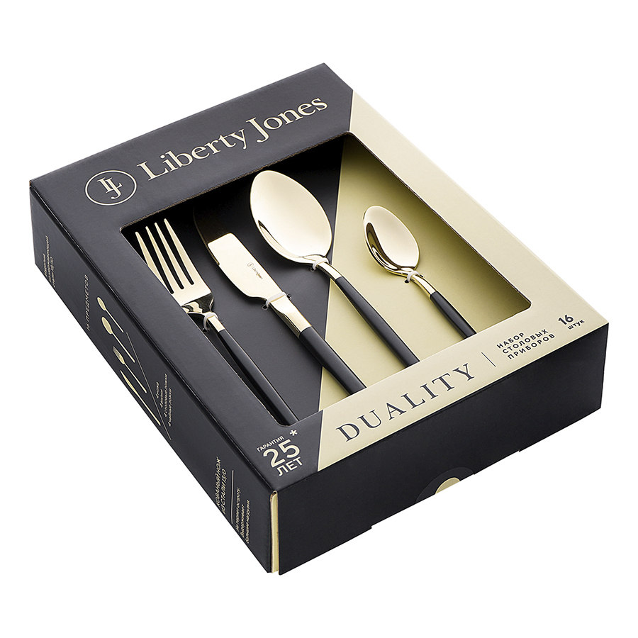 Столовые приборы Duality золотистого цвета с черными ручками украсят любую сервировку и подчеркнут вашу любовь к красивым предметам. Набор включает: 4 ножа, 4 вилки, 4 столовые ложки и 4 чайные ложки.