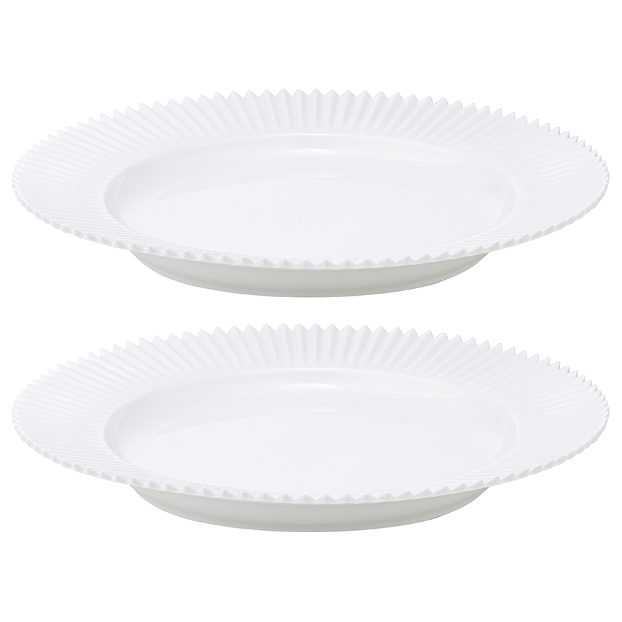 Набор из двух больших тарелок белого цвета подойдет как для праздничной сервировки, так и для обычного ужина в будний день. Фарфоровые борта тарелок имеют рифленую поверхность и оригинальный зубчатый край, что добавляет им утонченности и изящества. При этом они достаточно прочны, чтобы выдерживать мытье в посудомоечной машине, так что ухаживать за ними будет очень просто. С этими тарелками можно составить целый сервиз, добавив к ним другую посуду из серии Edge — например, чашки и салатники.