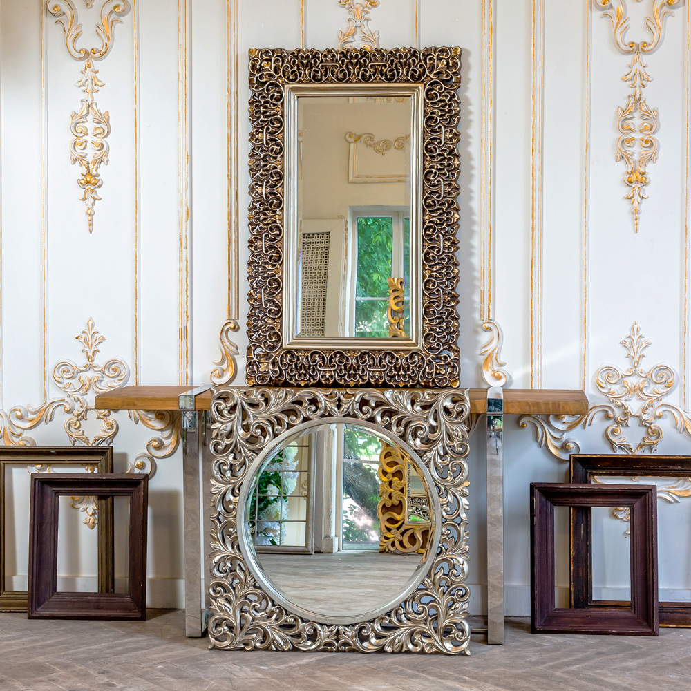 Дизайн зеркала Багдад синтезирует вкусы разнообразных интерьерных жанров: романского классицизма, византийского стиля, арабской и индийской этники. Кропотливое сплетение тонких узоров достойно музейного внимания. В столь благородном обрамлении любое отражение останется довольным собственной статью и благородством. Цвет состаренной бронзы облагородит любое интерьерное окружение. Элементом роскоши светится широкая фацетная грань. Рама - полиуретан; зеркало серебряной амальгамы; толщина зеркального стекла - 4 мм