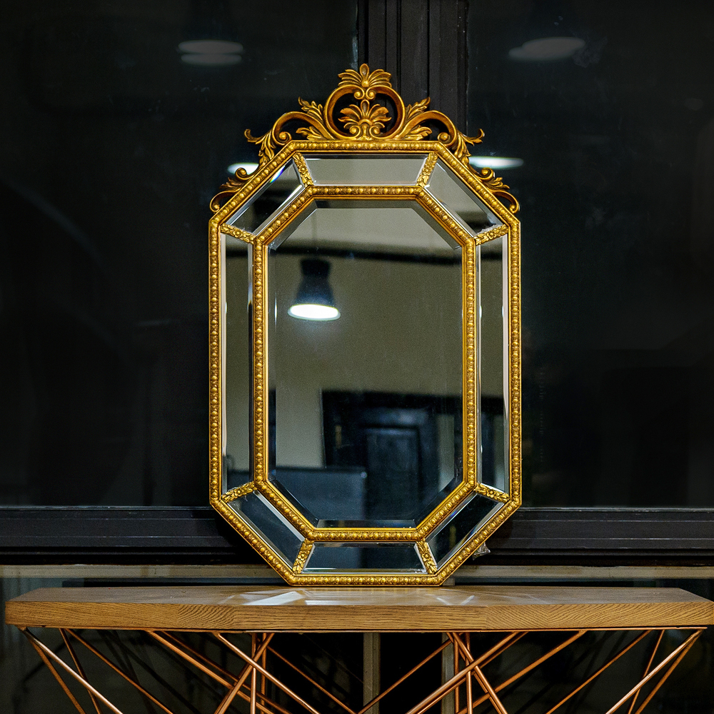 Помимо венцового узора, едва ли не главным украшением зеркала Кармина являются фацетные грани, опоясавшие каждый из сегментов двухъярусной зеркальной рамы. Калейдоскоп отражений обретает объемность и глубину. Окантовка граней цепочкой золотистых бусин осыпает пространство праздничным настроением. Для удобства подвески крепления заранее соединены тонким металлическим тросом, обеспечивающим легкую центровку.