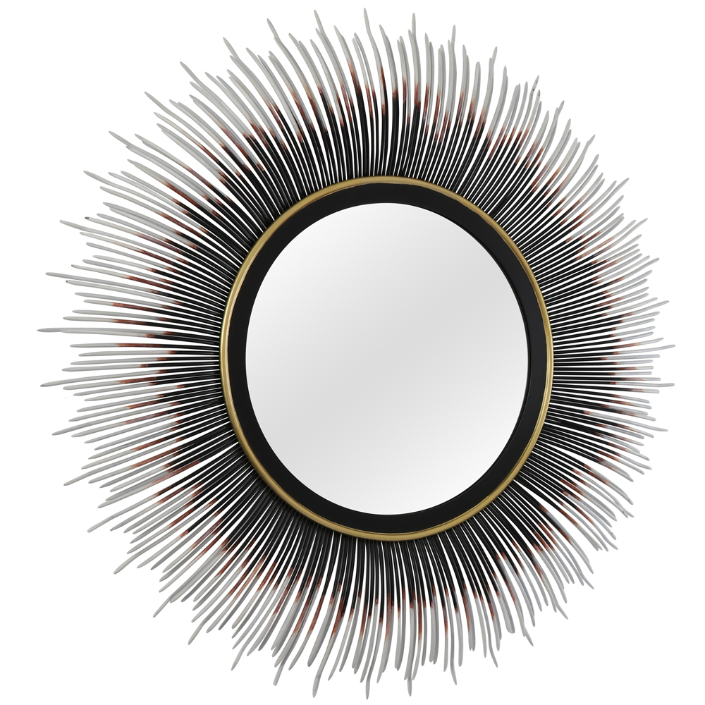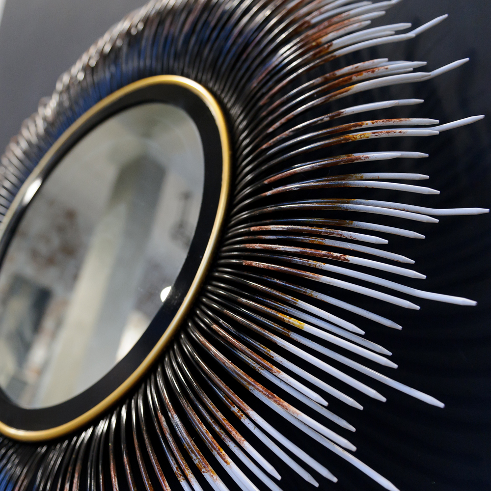 Зеркало Медея удивляет рамой, состоящей из тонких лучей, сходящихся по окружности в удивительно ровные клинья. Их выпуклая форма и равномерный черно-белый раскрас задают объемность и искусственный отблеск. Романтичность и гармония - желанный выбор любого интерьера. Размер зеркального полотна: Ø 41 см