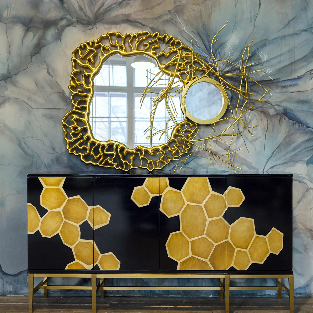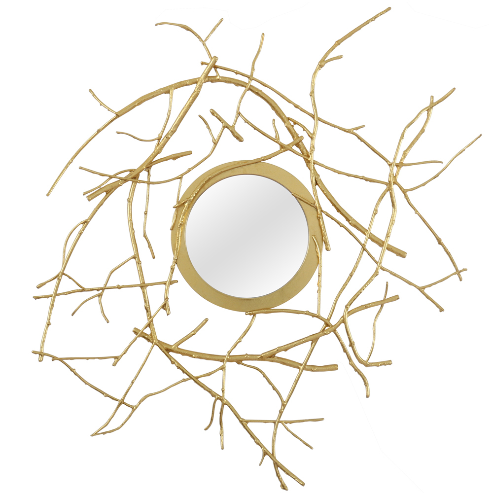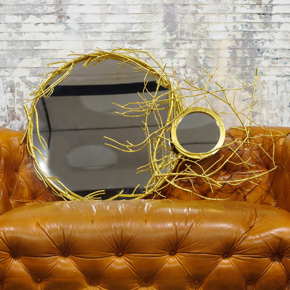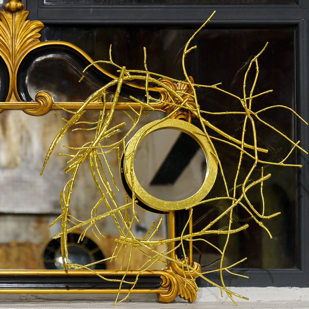 Зеркало Северина очаровывает обилием тонких деталей, разыгрывающих сценарий волшебного леса. В солнечный летний день это зеркало станет для Вас освежающим альпийским чилл-аутом. Ветвистый природный орнамент одинаково эффектен для однотонных стен или цветных обоев. Обладая широким периметром, зеркало Северина дарует ощущение невесомости: линии узора тонки, элегантны и воздушны. Рама окрашена светлым тайваньским золотом, - цвет яркий, но в то же время мягкий и ненавязчивый, приветливый для любых окружающих расцветок. Размер зеркального полотна: Ø 26 см