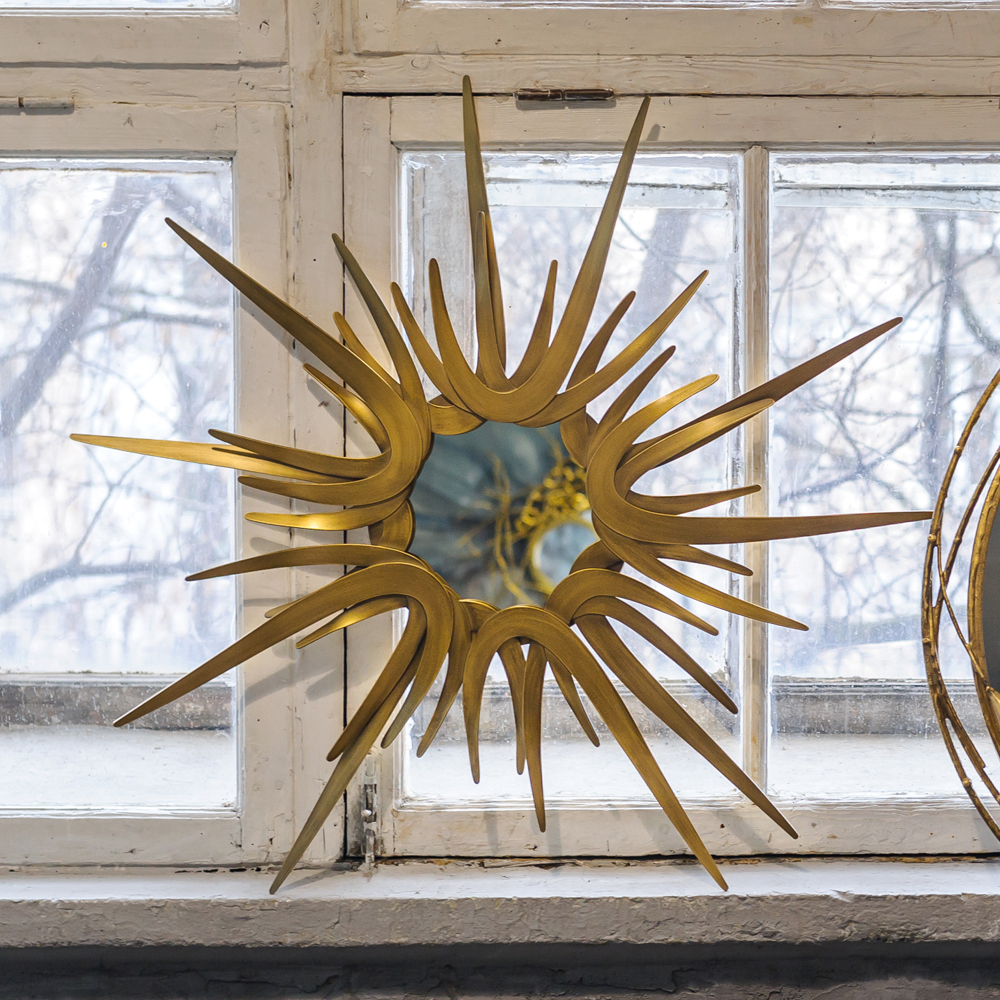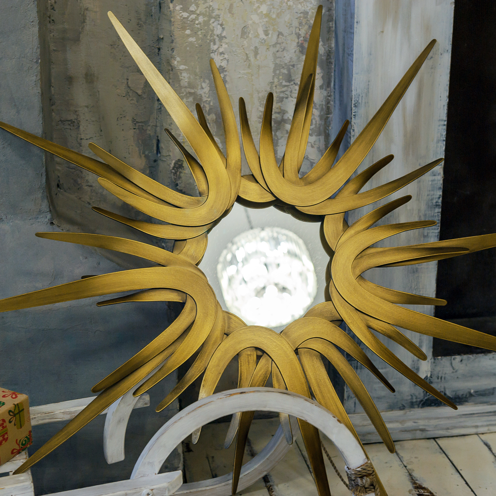 Как залог уюта, особым почтением в интерьерах пользуется латунный цвет, навевающий теплое обаяние старины и бесспорно подходящий к разнообразному цветовому окружению. Интерьерная популярность небесных светил объясняется не только сегодняшней модой. Идеальная симметрия приветствует звёздные зеркала любому домашнему помещению, довольному мягкой цветовой гармонией и лучистым настроением. Обратите внимание на готическое сплетение лучей, награждающее интерьер романтической волной. Диаметр зеркального полотна 25 см.