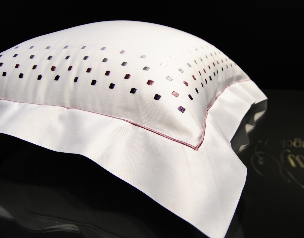 Дизайн - нежная вышивка квадратных точек на белоснежном сатине наволочек и пододеяльника. Это орнамент в виде одной широкой сплошной и 4-х линий точек по периметру наволочки.