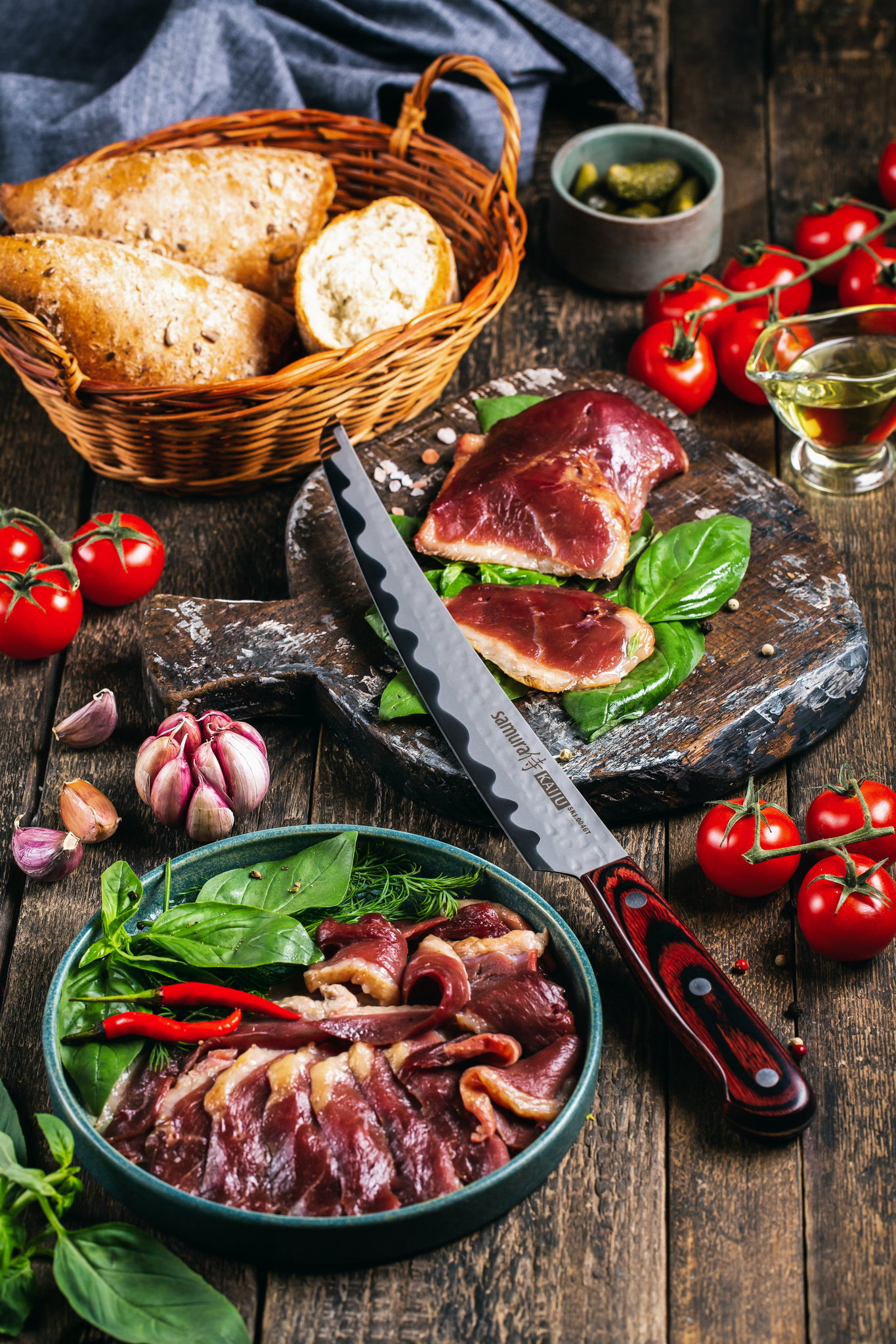 Нож для нарезки Kaiju (слайсер) 230 мм длиной, применяется для аккуратного пластования на тончайшие ломтики колбасы, балыка, сыра, соленой и копченой рыбы. Длина лезвия слайсера Samura Kaiju достаточна для реза практически любого продукта одним проходом – 23 см первоклассной стали не бывают лишними в поварском деле.