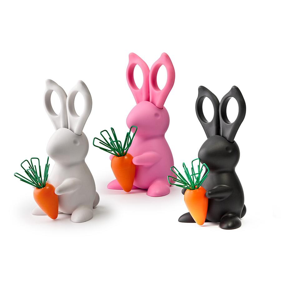 Зайчик 2 в 1! Это и острые ножницы - ушки и хорошенький диспенсер для скрепок в виде магнитной морковки. После того как закончатся, входящие в комплект скрепки, Вы можете использовать любые другие, желательно зеленого цвета:)