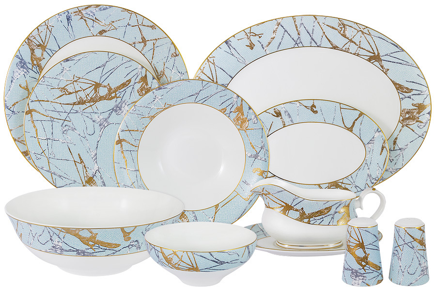 6 обеденных тарелок 27см , 6 суповых тарелок 21,5см , 6 закусочных тарелок 21см , 1 салатник 23см , 2 салатника 14см , 1 блюдо 36см ,1 блюдо 23см , соусник + блюдо под него солонка перечница