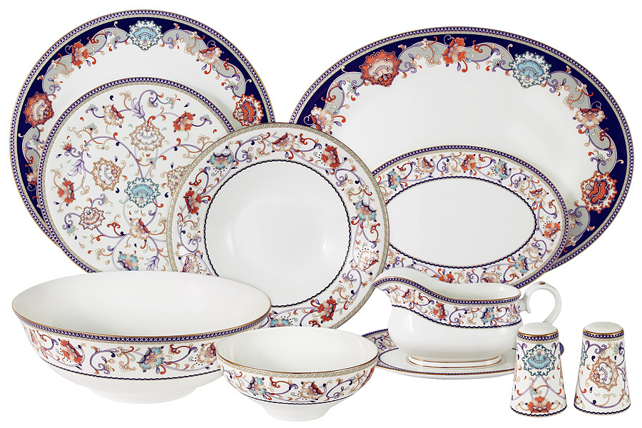 12 обеденных тарелок 27см, 12 суповых тарелок 21,5см, 12 закусочных тарелок 21см, 2 салатника 23см, 4 салатника 14см, 2 блюда 36см, 2 блюда 23см, соусник с блюдом, солонка перечница