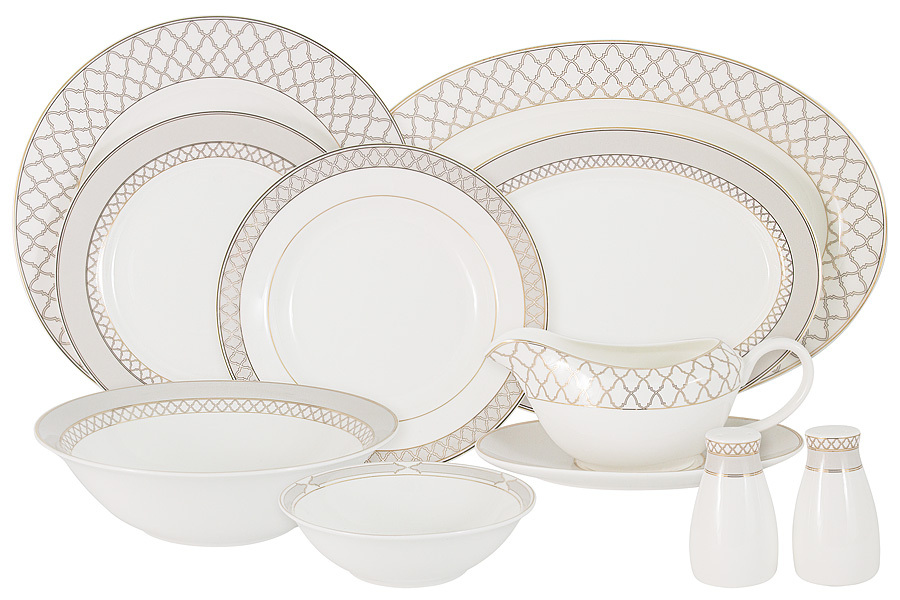 12 обеденных тарелок 27 см; 12 суповых тарелок 21 см; 12 закусочных тарелок 21 см; 2 салатника 23 см; 4 салатника 16 см; 2 блюда 36 см; 2 блюда 26 см; соусник+блюдо под него; набор для специй