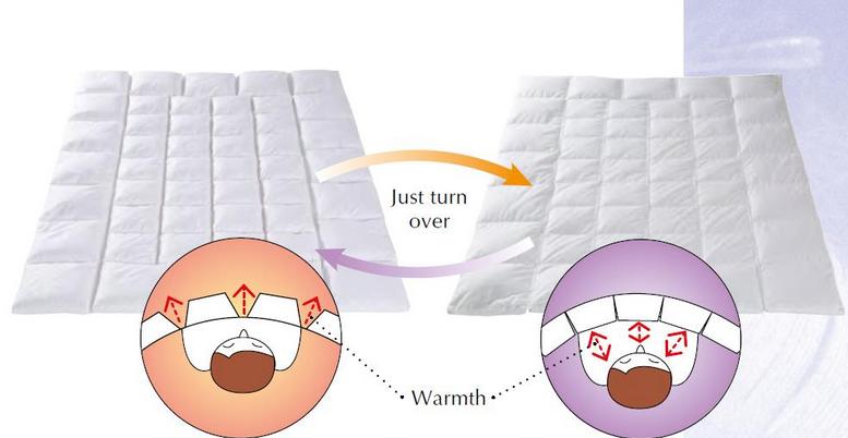 Структура одеяла кассетная: кассеты пришиты на одну сторону одеяла на расстоянии 1см друг от друга. Когда вы укрываетесь стороной, на которую пришиты кассеты, вы получаете легкое одеяло, т.к. кассеты раскрываются и излишнее тепло проходит через промежутки ткани, не заполненные пухом (кассетами). Когда вы укрываетесь другой стороной одеяла, кассеты соединяются, незаполненные пухом промежутки пропадают, и вы получаете теплое одеяло. Т.е. это универсальное одеяло, которое можно использовать всесезонно, одеяло с климатконтролем.