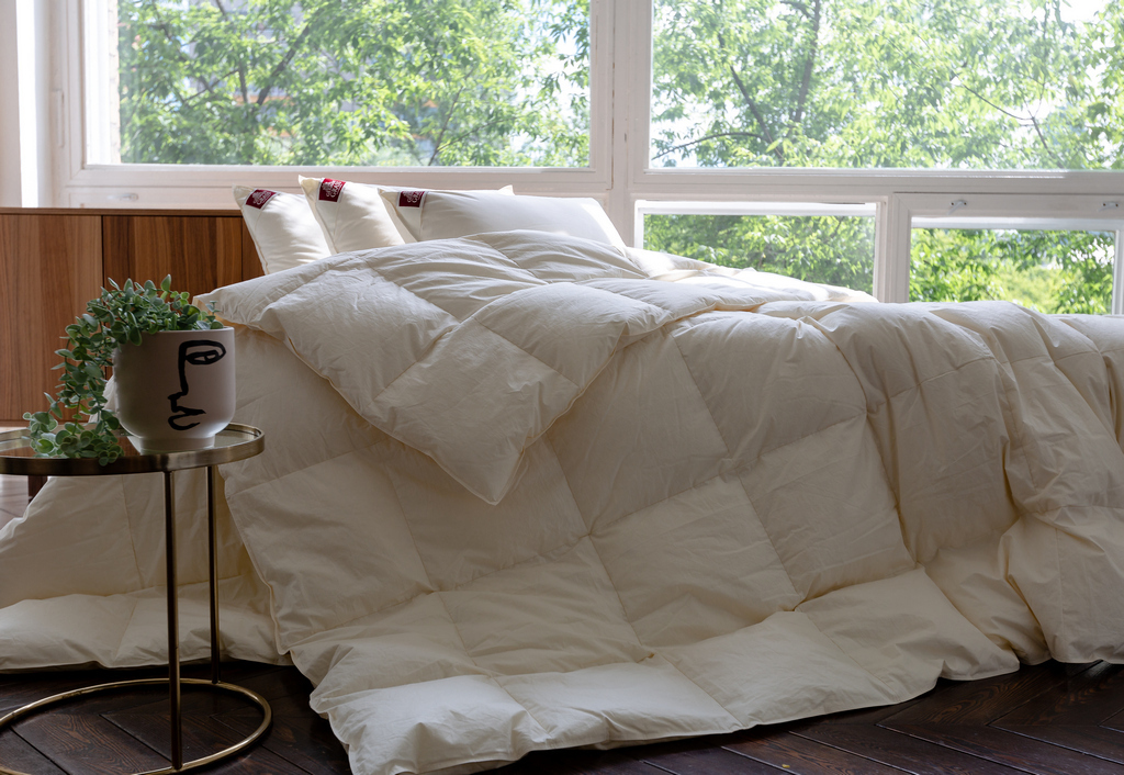 Тончайший батист имеет сертификат GOTS, свидетельствующий о том, что сырье для его создания выращено в контролируемом биологическом хозяйстве, без использования химических добавок и соответствует строгим экологическим критериям. Ткань дополнительно прошла финишную обработку SanProCare® Sensitive и отмечена маркировкой «Bramscher Tuch», что является безусловным знаком качества от специалистов из города Бра́мше в Германии. Наполнителем для коллекции служит гусиный пух категории "Экстра" повышенной упругости (Fill Power 850 ед). При малом весе он обладает особенной пушистостью и лучшей теплоизоляционной способностью. Стирка при температуре до 30°С.